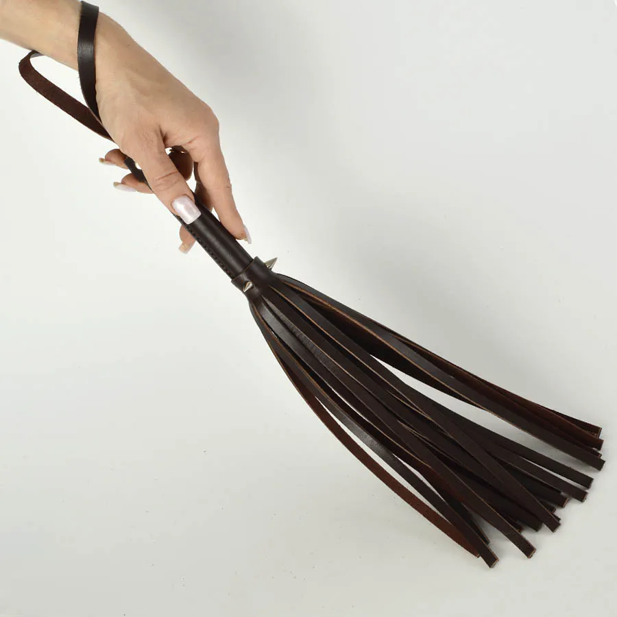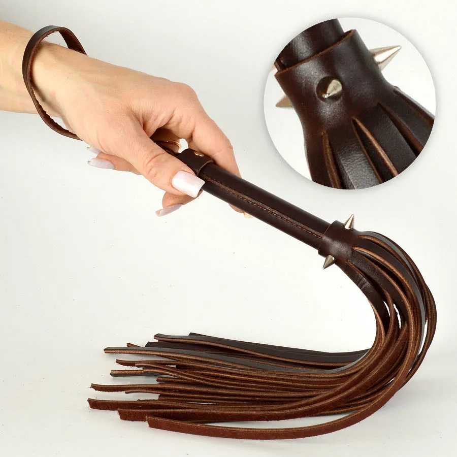 Плеть изготовлена из натуральной коричневой кожи и украшена тремя металлическими шипами. Общая длина - 40 см, длина ударной части 26 см. Длина шипов 1 см.