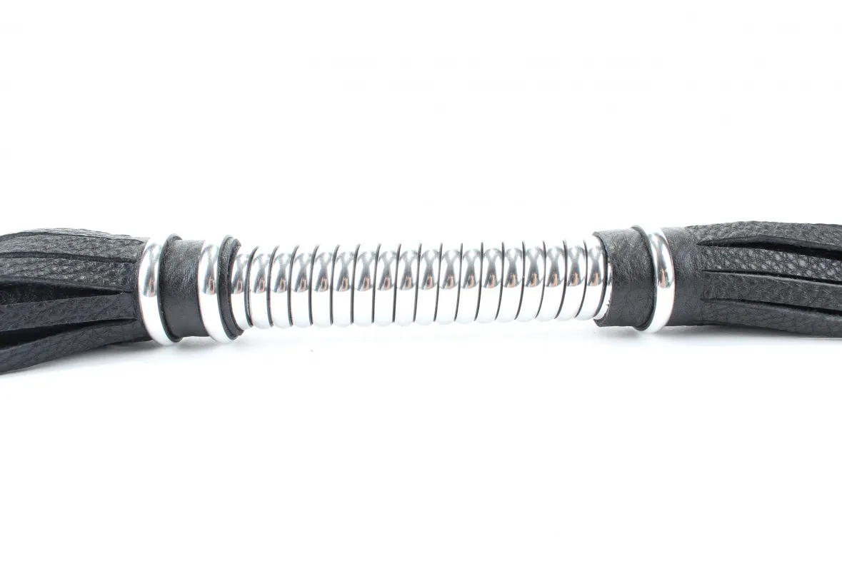 Аккуратная черная плетка, изготовленная из натуральной кожи. Имеет жесткую витую рукоятку серебряного цвета длиной 16 см.. Имеется петля для удобного использования плети. Длина хлыстов - 28 см.