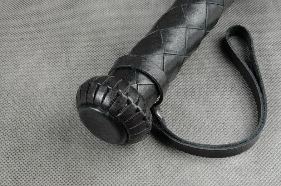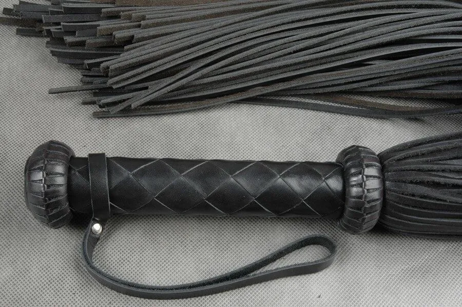 Плеть "Грешница" от бренда Beastly состоит из 90 прямоугольных полос и плетеной рукояти, украшенной ограничителями в виде "фонариков." Такой аксессуар позволит Вам со всей страстью наказать своего партнера и преподать ему пару уроков послушания. Плеть сделана из натуральной кожи черного цвета средней жесткости. На рукояти, плетенной 6 широкими полосами ромбом, есть петля для фиксации плети на запястье.