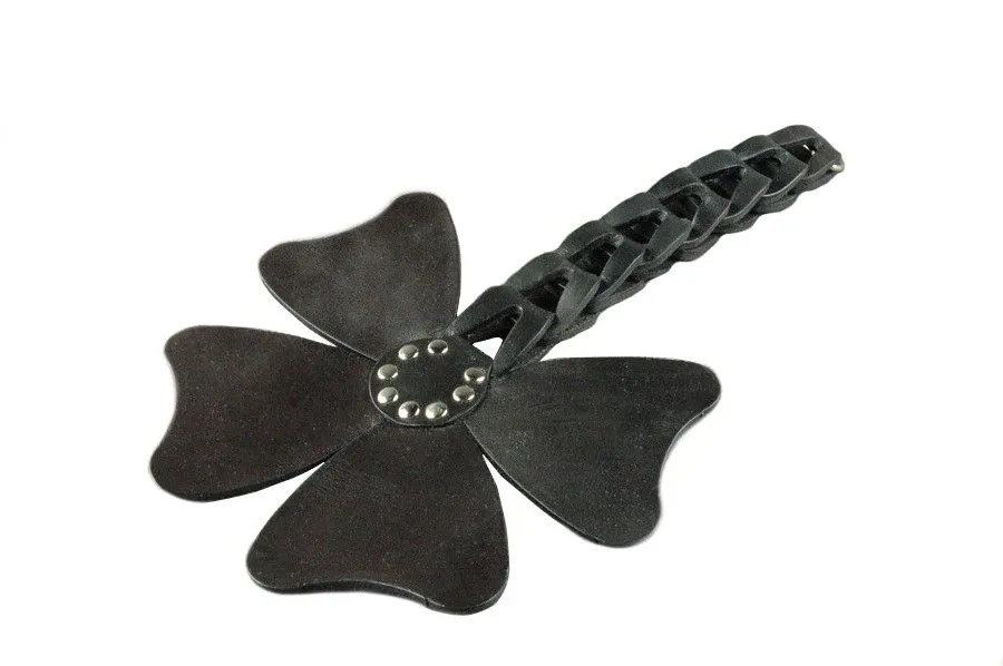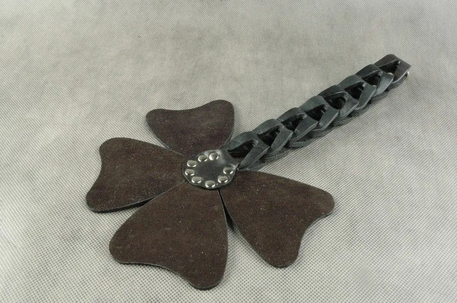 Шлепалка "Четырехлистник-2" от бренда Beastly сделана из натуральной кожи черного цвета в оригинальном дизайне в виде листа клевера и декорирована 8 металлическими клепками. Четыре ее лепестка закреплены на ручке из 8 кожаных звеньев. Наносите ей чувствительные удары по ягодицам или бедрам, которые будут сопровождаться звонкими и возбуждающими шлепками. После наказания кожа еще долго будет гореть огнем, напоминая о мучительном, но вместе с тем сладком удовольствии.