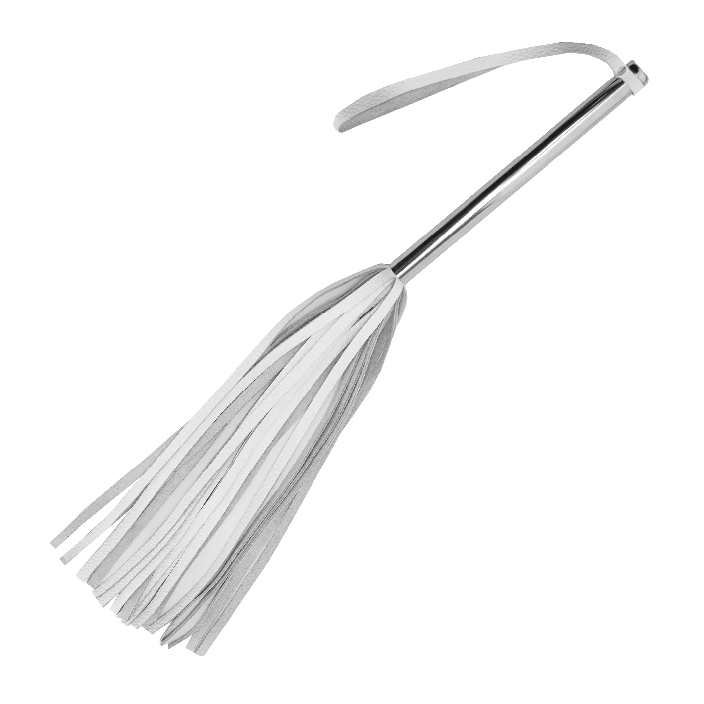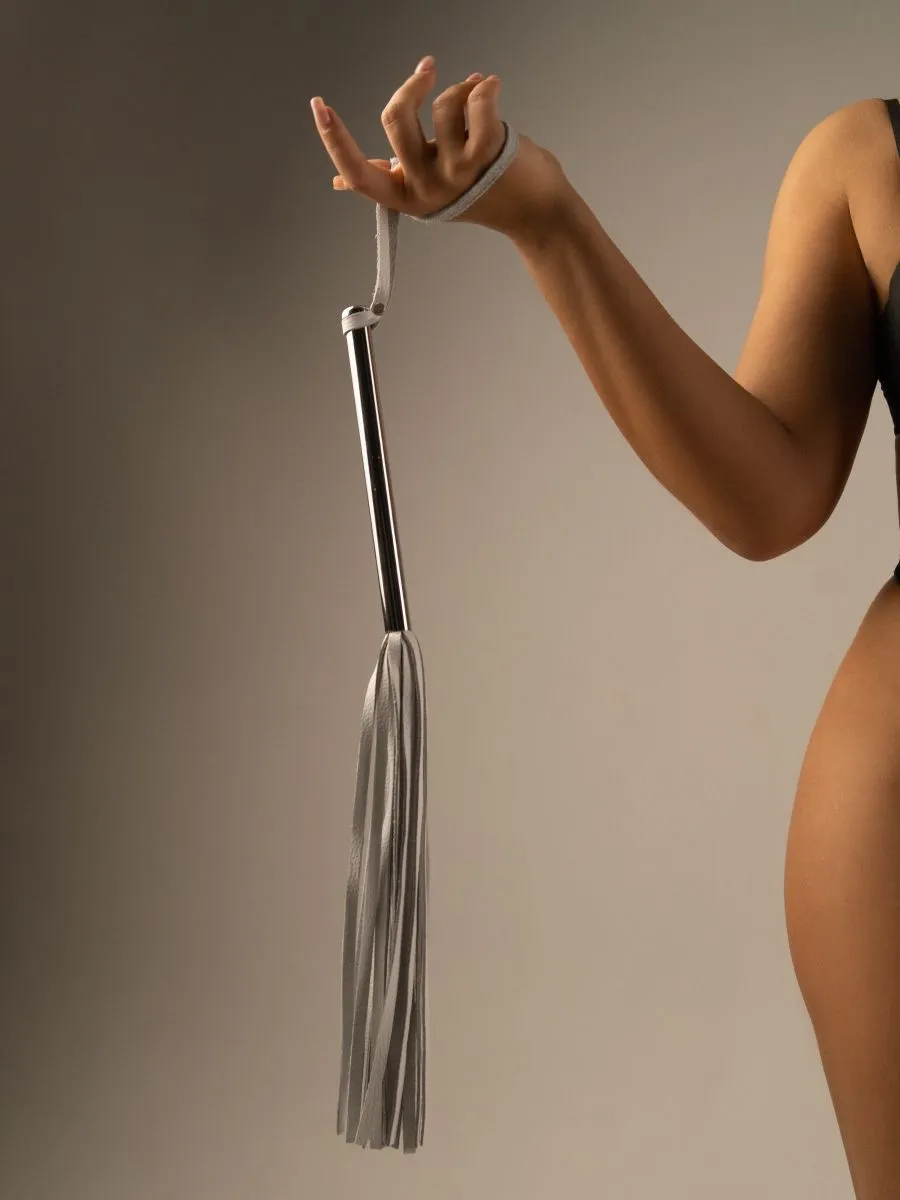 Флоггер выполнен из натуральной кожи черного цвета, а ручка - из гладкого металла серебристого цвета. На ручке имеется кожаная петелька для запястья, благодаря которой плеть не выскользнет из Ваших рук.