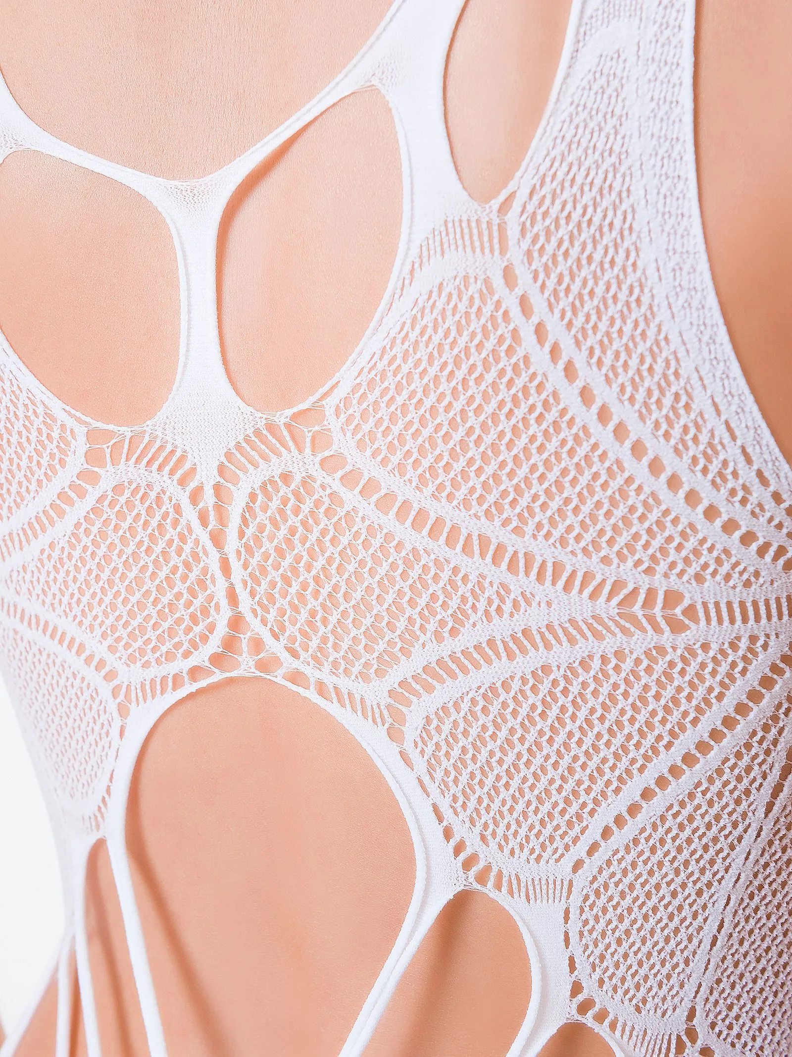 Эротический костюм-сетка выполненн в оригинальном стиле. Имитация топа с замысловатым узором из вырезов вокруг шеи, на спине и на животе рождает откровенные фантазии. Кружевной узор в виде цветка в интимной зоне акцентирует внимание на самом главном. Отличный вариант наряда для романтической прелюдии. Интимный вырез делает этот костюм идеальным для сексуальных игр с Вашим партнером.