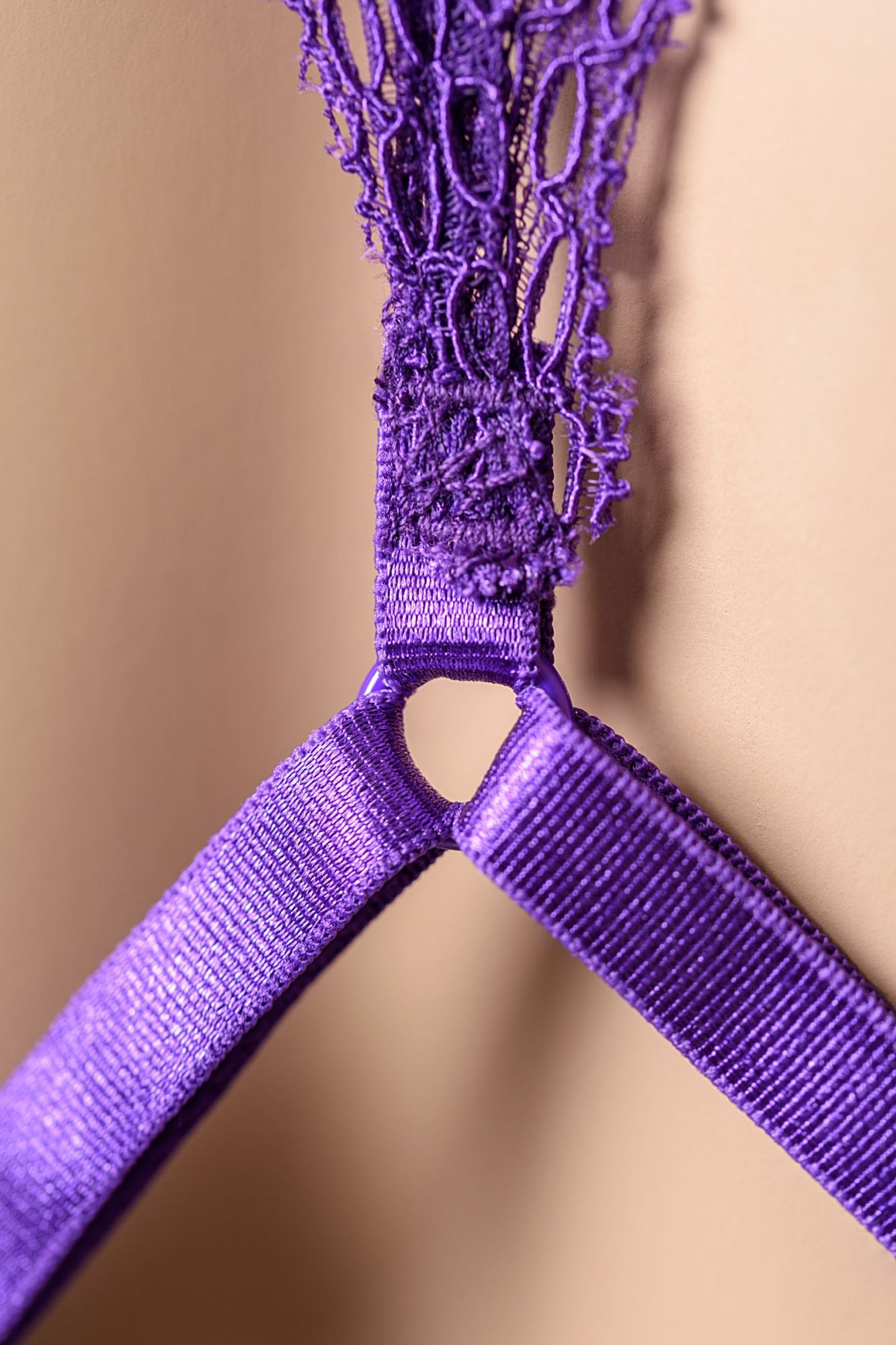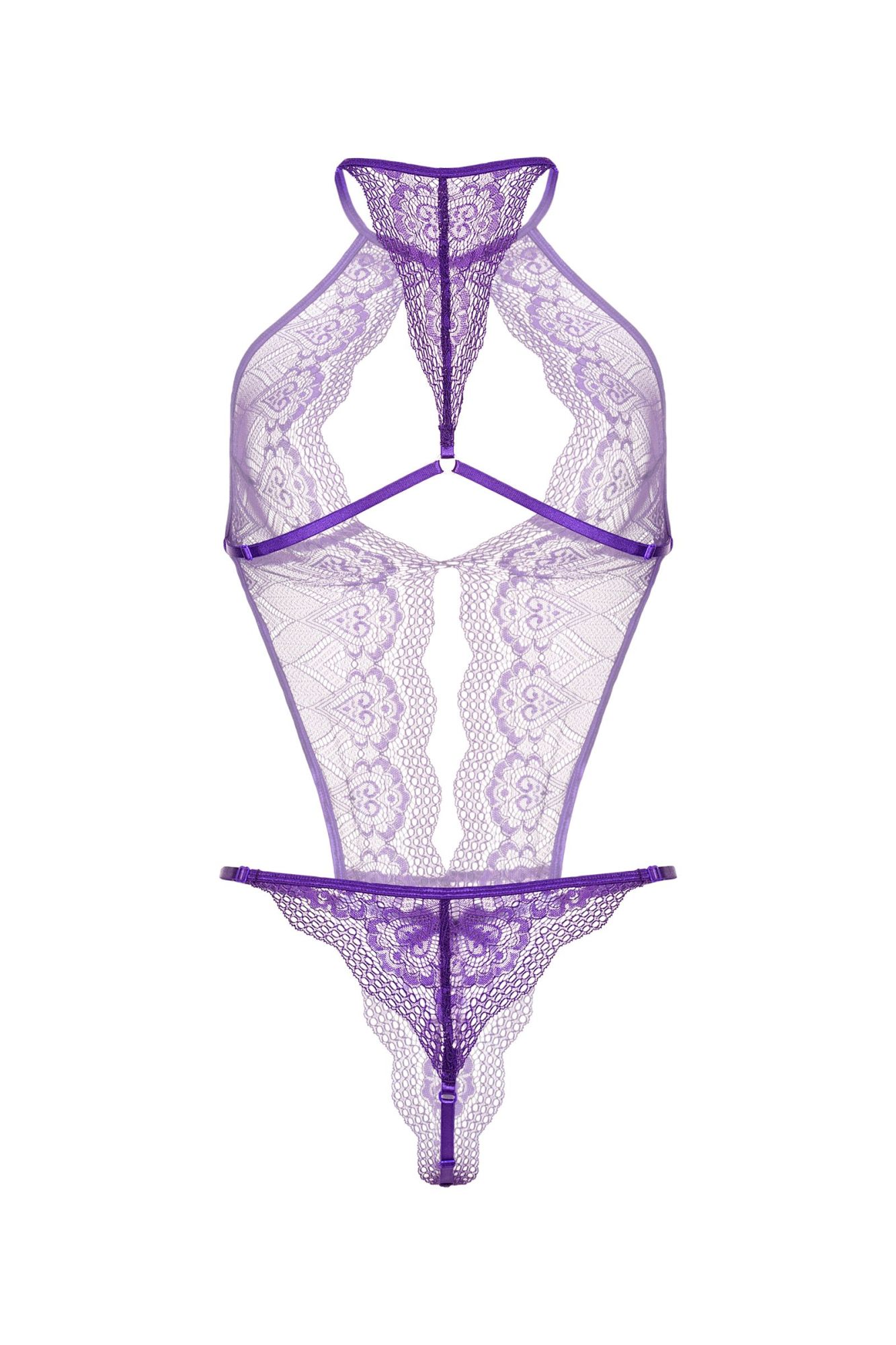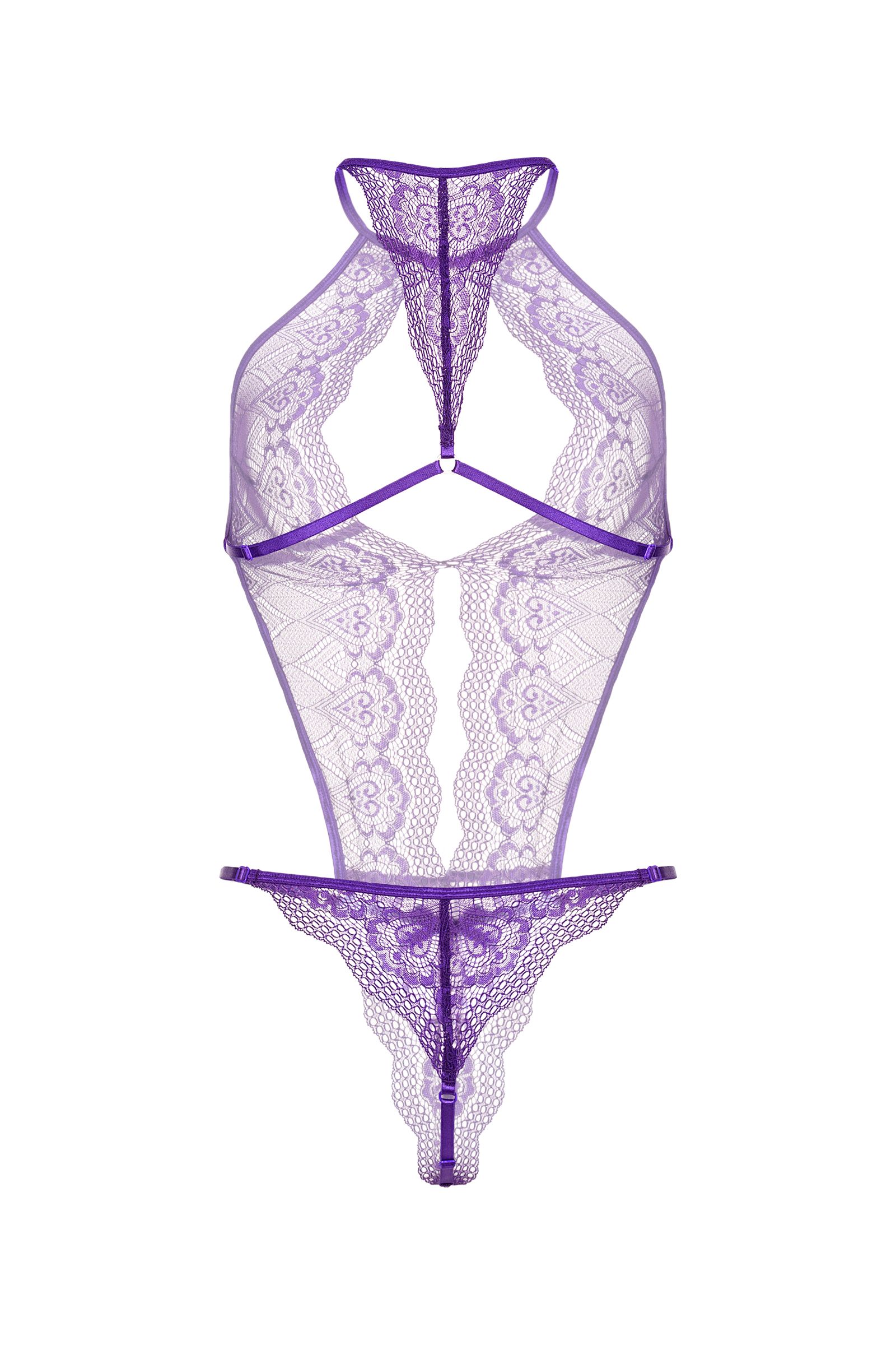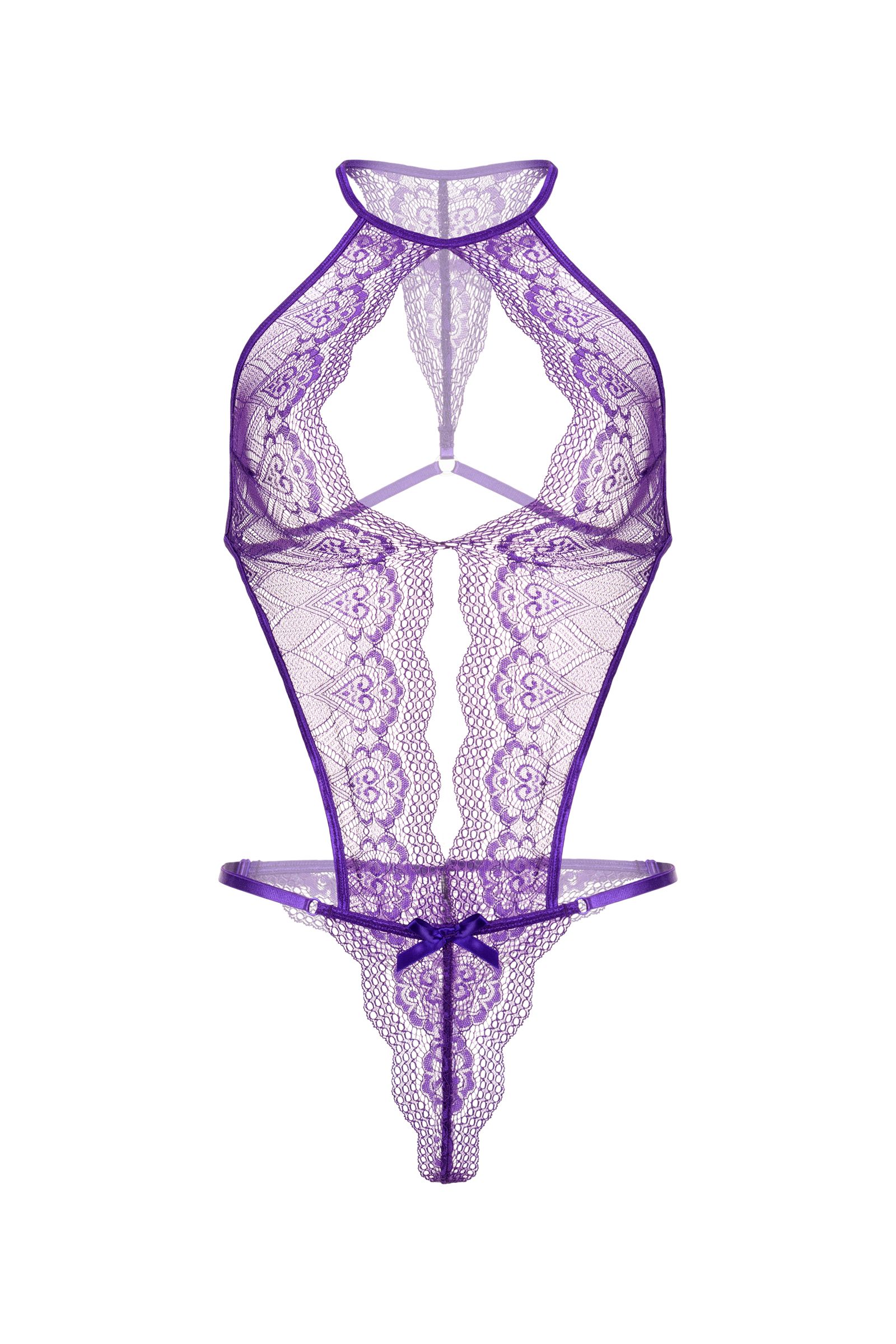 Кружевное боди с глубоким фигурным декольте, украшенным сатиновым бантиком. Застежка на шее, регулируемые перемычки на спинке, на бедрах, в интимной зоне.