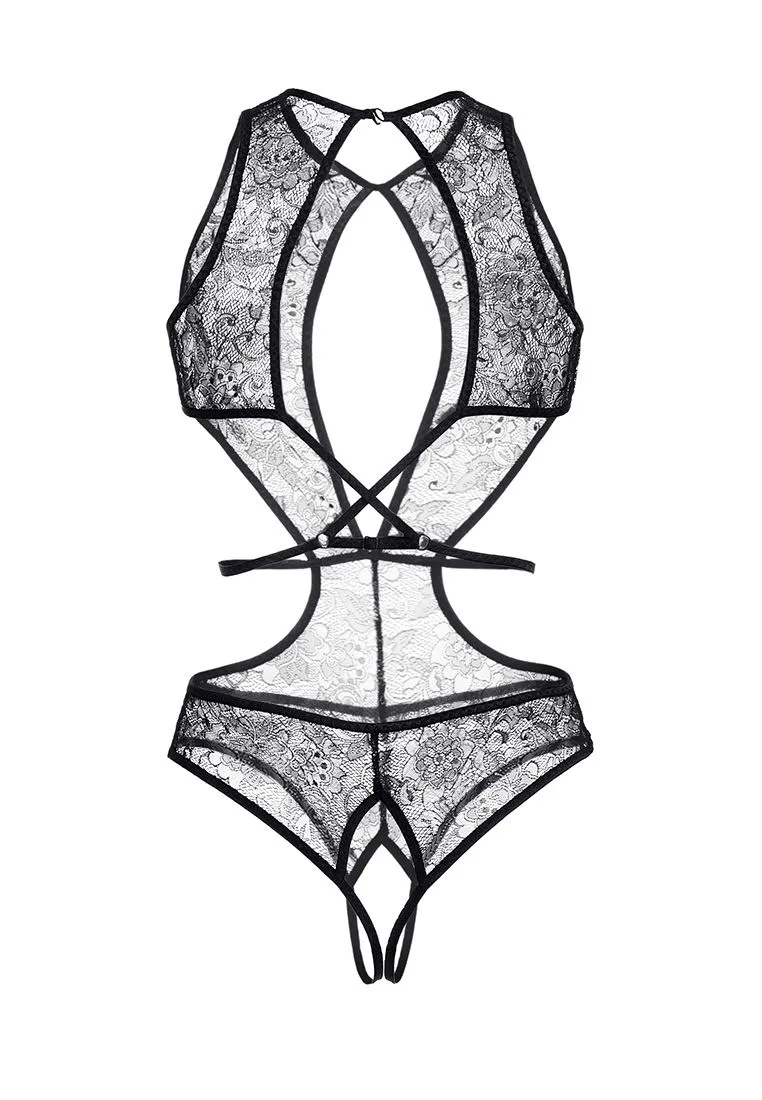 Эротическое боди Erolanta® Lydia из плотного кружевного полотна, с фигурным декольте. Застежка на шее. Открытая спинка. Перекрещивающиеся бретели соединены с регулируемым поясом. *Допускается замена кружева на аналогичное. Ростовка изделия 162-164 см. Как надеть? Начните с нижней части боди: надевайте также, как любые трусики; подтяните на бедра. После этого руки и голову аккуратно проденьте в поясок и верхнюю часть боди.