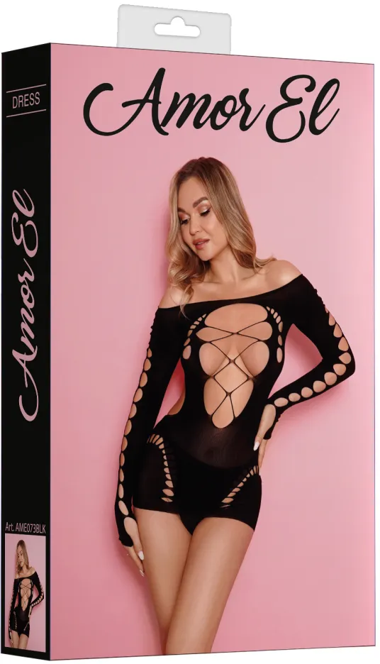 Откровенное мини-платье с длинными, спущенными с плечей рукавами и вырезами в виде шнуровки на груди и ягодицах.