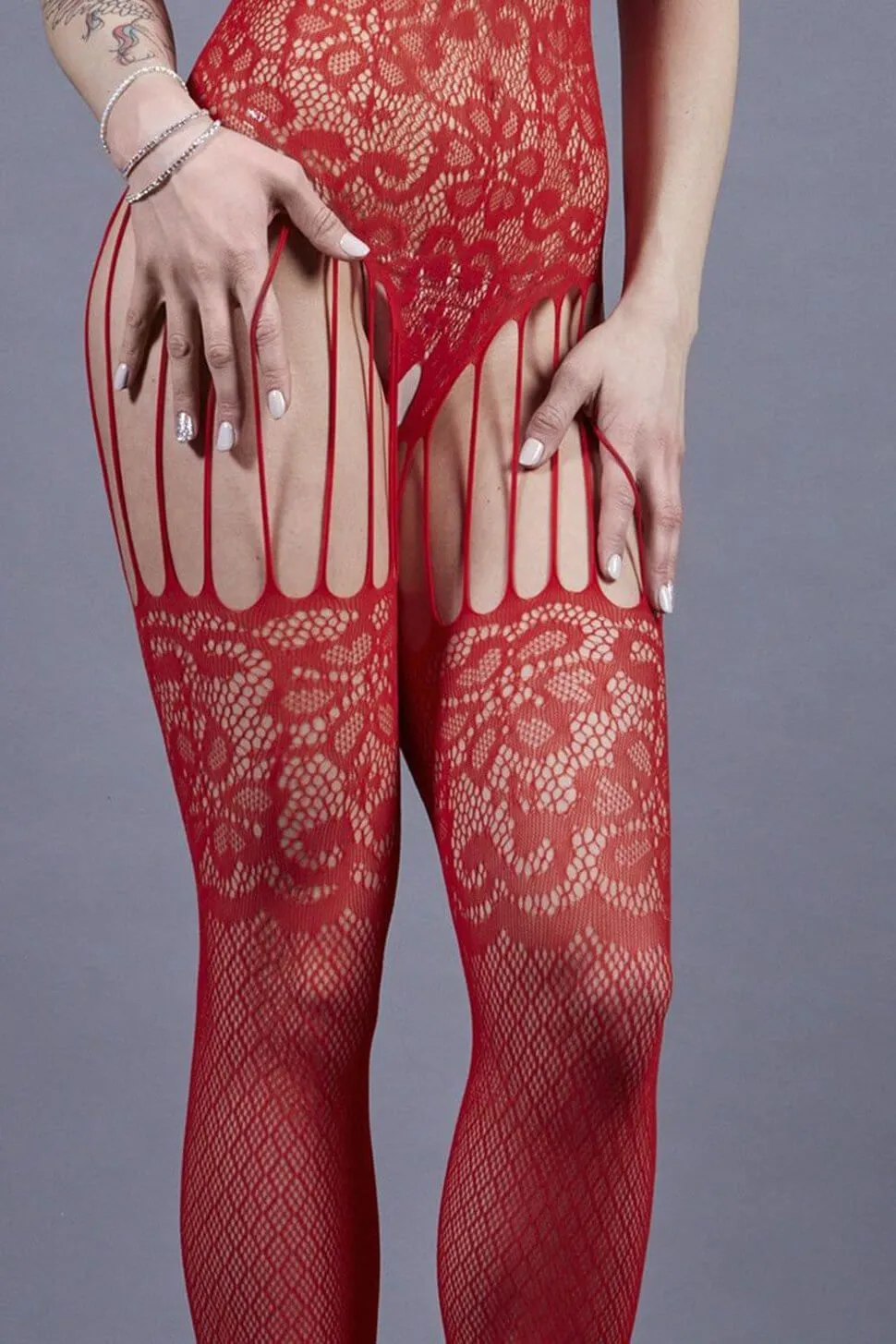 Соблазнительный боди-комбинезон от компании Le Frivole сделан из красного прозрачного материала в мелкую сетку, декорированного узором с цветочным мотивом. Он выглядит необычайно элегантно и чувственно благодаря имитации чулок с широкой резинкой и множеством подвязок, которые создают соблазнительные вырезы на бедрах. Прозрачный материал почти не скроет фигуры от глаз партнера, позволяя ему угадывать очертания Ваших прелестей и еще сильнее желать Вас. Боди-комбинезон хорошо тянется, поэтому подойдет дамам с размерами S, M и L.