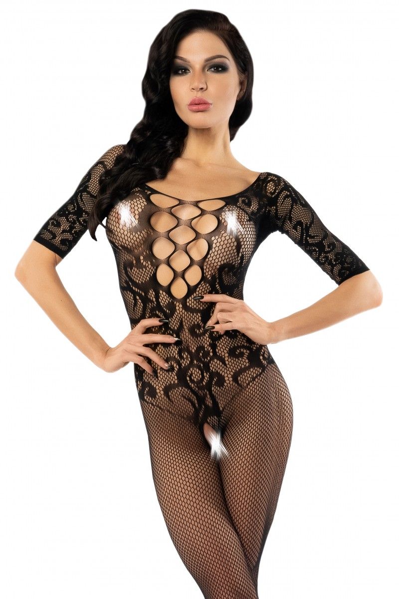 Эффектный кетсьюит полностью закрывает ноги, подчеркивая их стройность и зрительно увеличивая длину. При этом зона промежности остается открытой, костюм не придется снимать при завершении прелюдии. Его можно надевать без нижнего белья или комбинировать с бюстгальтером, он отлично подойдет для смелых экспериментов в постели. Эластичный материал легко растягивается, зона декольте дополнена глубоким вырезом и переплетением тонких веревочек , что делает образ еще более соблазнительным! Выполнен из мелкой сеточки с ажурным орнаментом по полочке, спинке и рукавам.