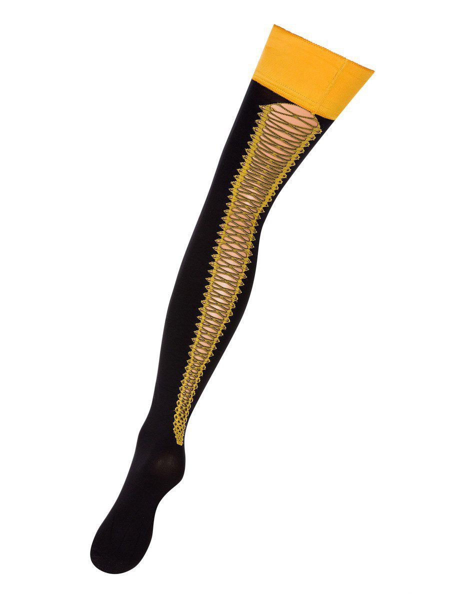 Изумительные чулки с эффектной шнуровкой по задней детали, подчёркивающей стройность и длину ног, а также чувство вкуса их обладательницы. Резинка с графическим принтом имеет силиконовую основу, позволяющую носить чулки без пояса.
