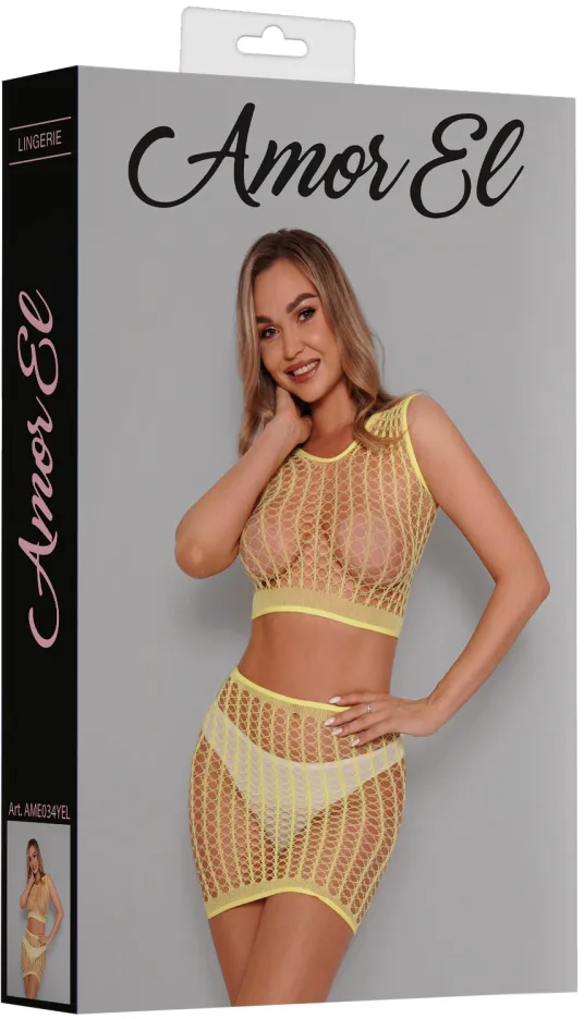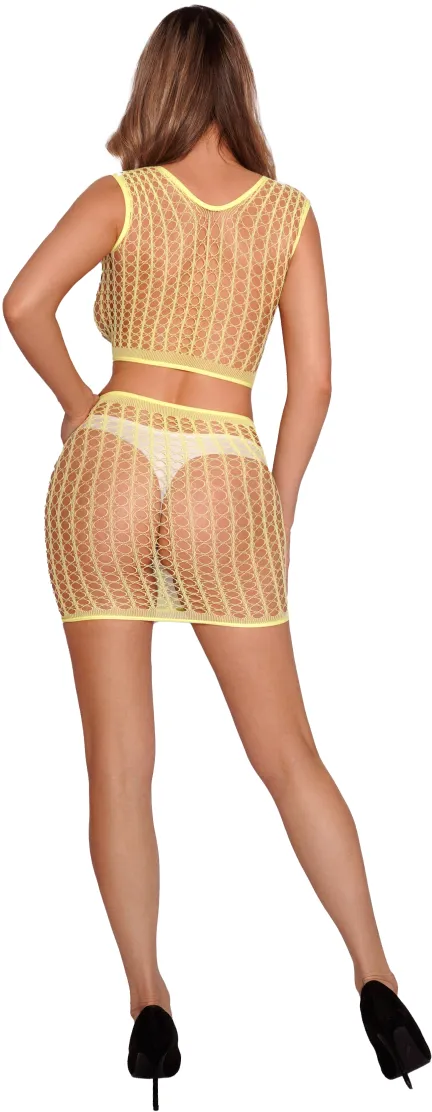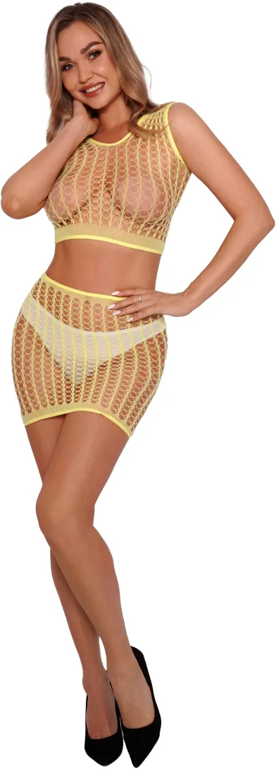 Комплект яркого и соблазнительного сетчатого белья, состоящего из полупрозрачного топа и короткой юбки.
