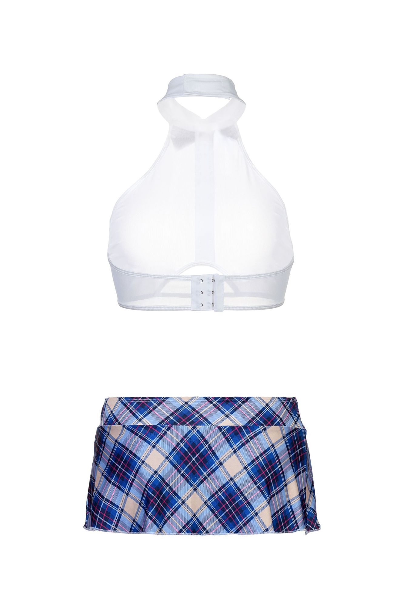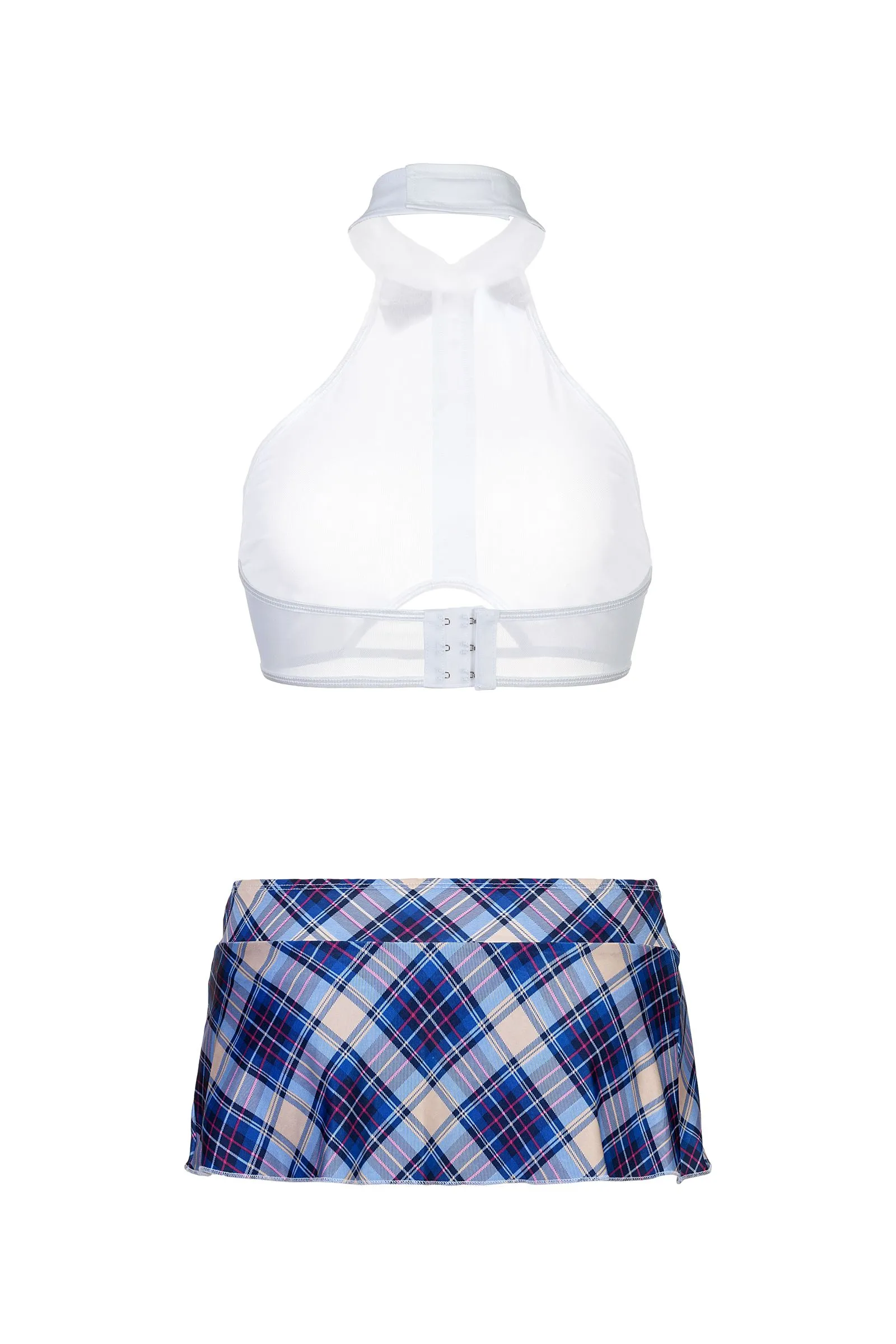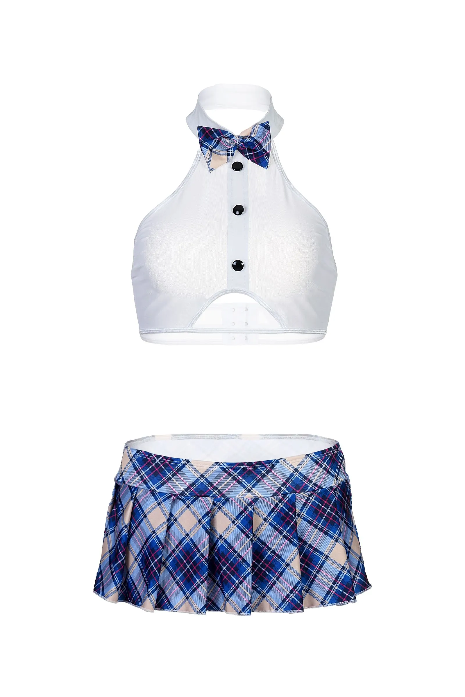 Костюм школьницы. Топ из эластичной сетки декорирован спереди непрозрачной вставкой и пуговицами, на застежке "крюк-петля" сзади. Воротник-стойка на "липучке", украшен контрастным бантом. Юбка, Т-стринги и бант выполнены из клетчатого трикотажа.