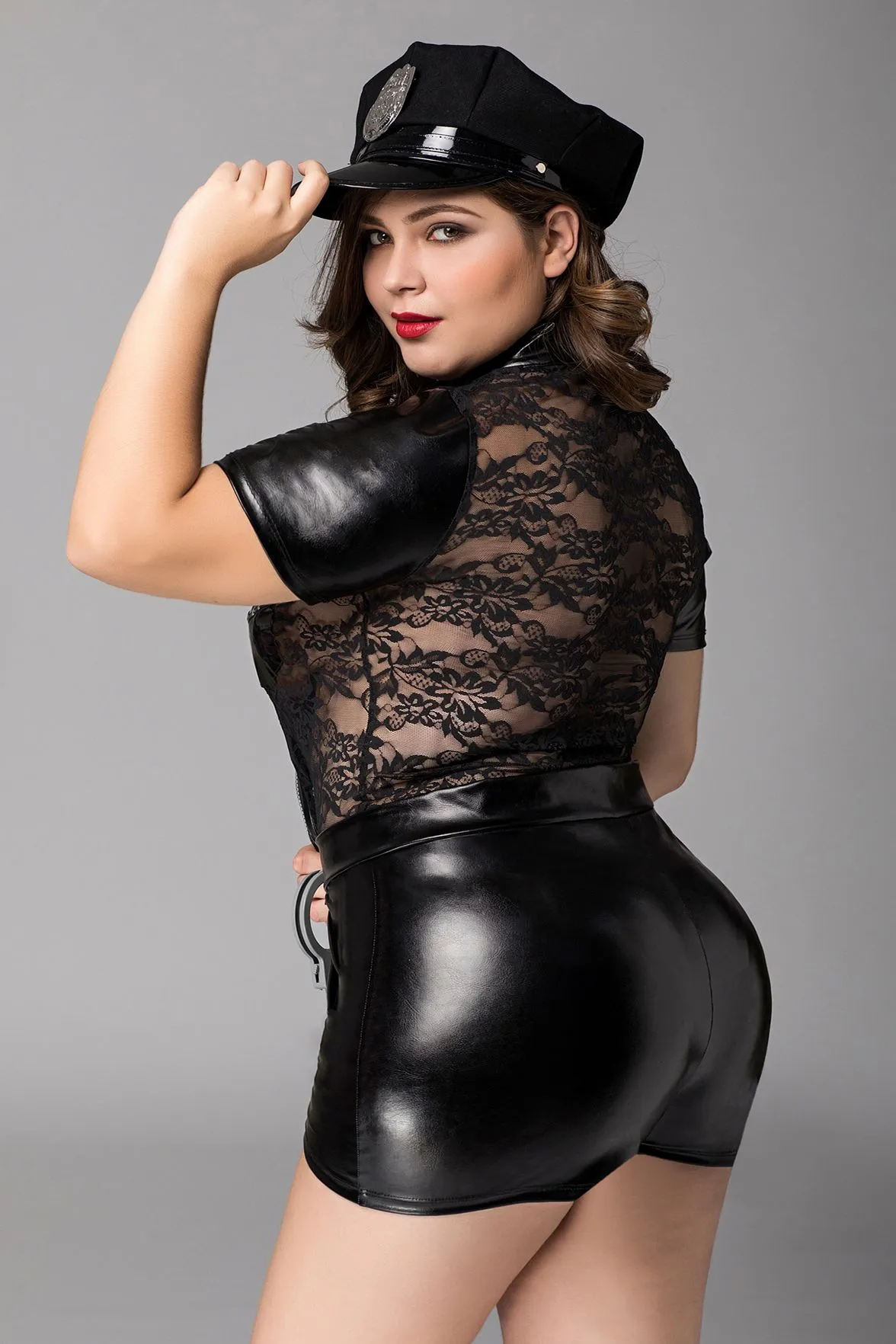 Комбинезон полицейского Candy Girl® Porsche из беспроигрышного сочетания тканей: wetlook и прозрачного эластичного кружева, выгодно подчеркивает фигуру. Воротник-стойка, непрозрачные короткие рукава и кепка полицейского со значком добавляют образу строгости. Лаковые вставки прикрывают самые интимные места груди, акцентируют внимание на талии. Молния без острых краев. Наручники входят в комплект.