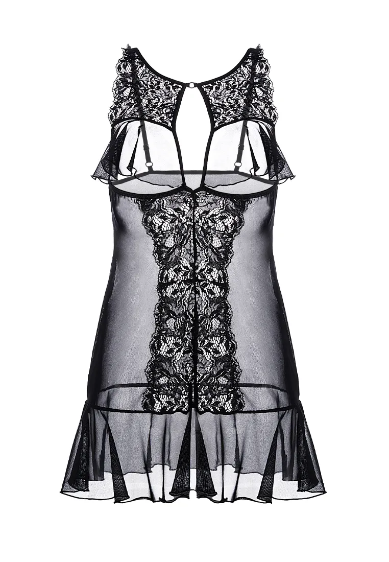Комбинация Erolanta® Margarita с открытой грудью, из эластичной сетки со вставками кружева. Бюст и подол декорированы мягкими оборками. Регулируемые бретели. *Допускается замена кружева на аналогичное.