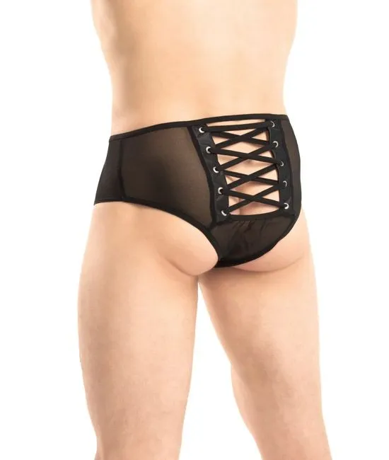 Широкие мужские плавки из эластичной полупрозрачной сеточки с регулируемой шнуровкой из резиночек сзади.
