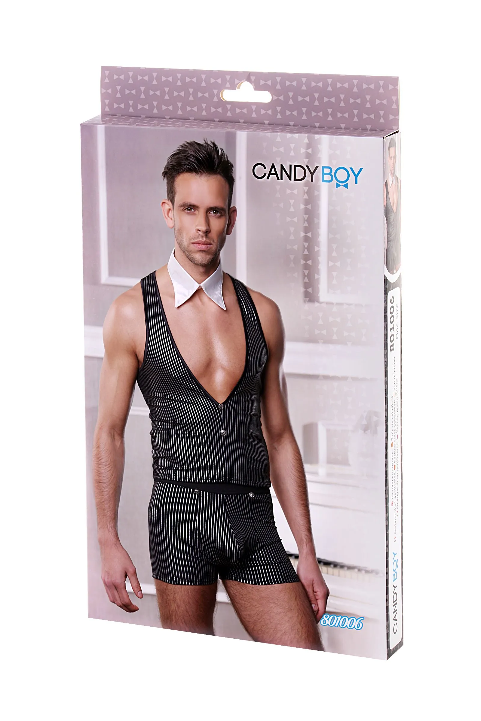 Этот элегантный ролевой костюм подчеркнёт природное обаяние мужчины, которое покоряет с первого взгляда. Ведь эластичная жилетка, трусы-шорты, украшенные серебристыми пуговицами, и воротник-галстук помогают создать не просто образ, а образ джентльмена, знающего толк в сексе высокого стиля.