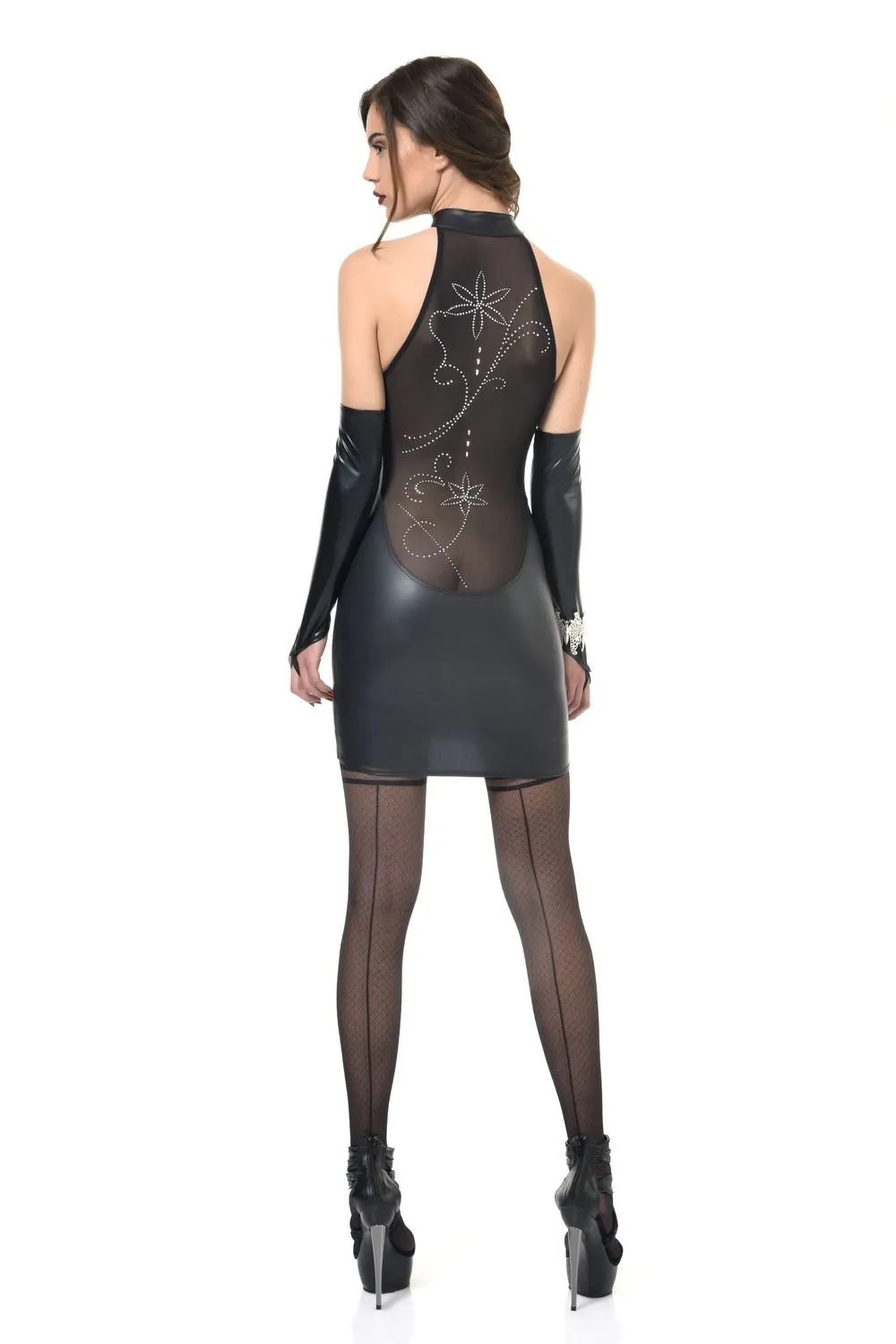 Сексуальное платье Vita из коллекции Tome 14.2 от французского модельера Patrice Catanzaro выполнено из плотного материала, напоминающего мокрую кожу, и прозрачной микросетки. Платье без рукавов, с короткой молнии на высоком воротнике. Вырез в области декольте и небольшая вставка из прозрачной ткани акцентируют внимание на груди. Сзади прозрачная ткань, соблазнительно доходящая до самых ягодиц, украшена цветочным узором из сверкающих стразов.