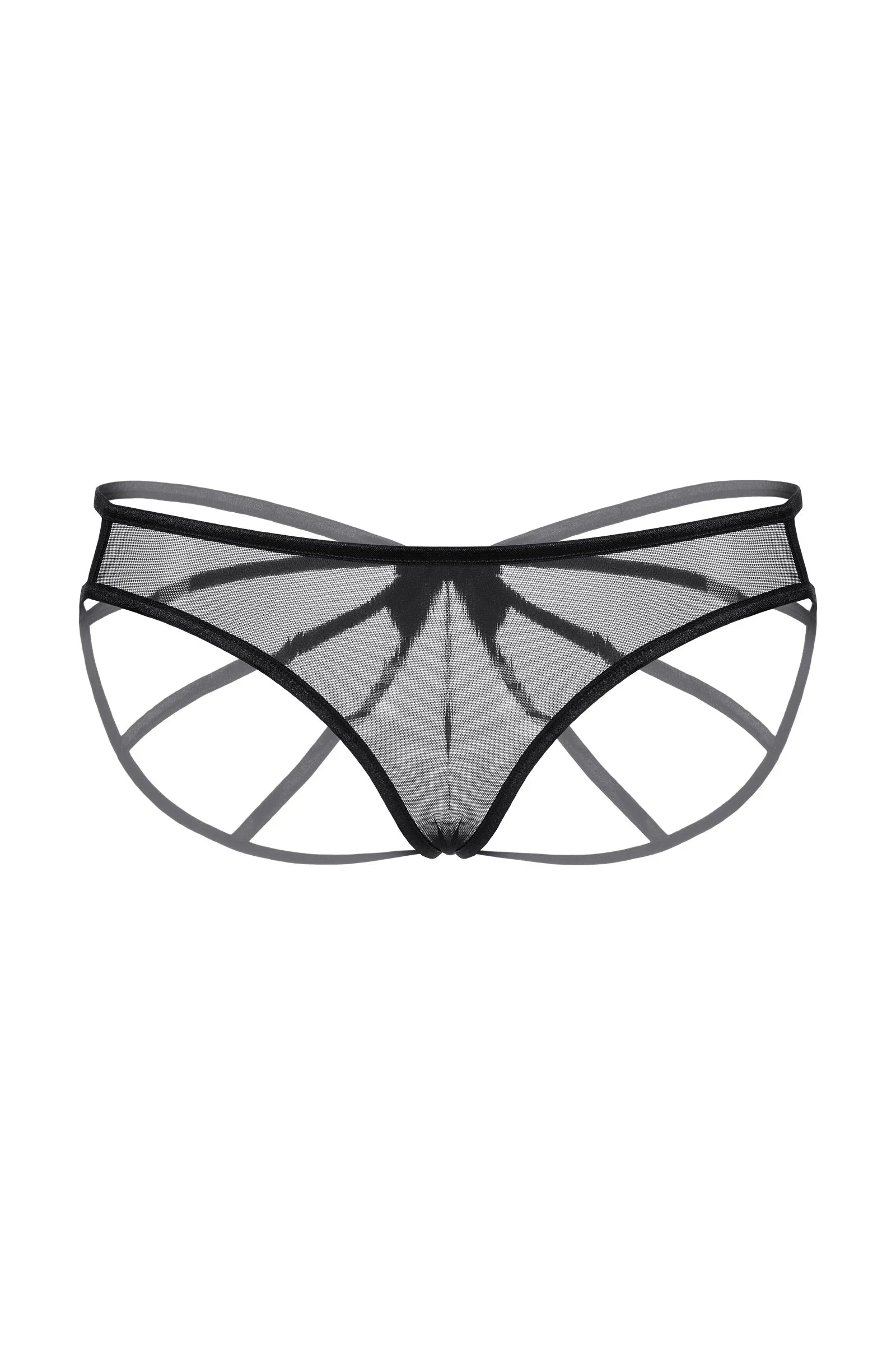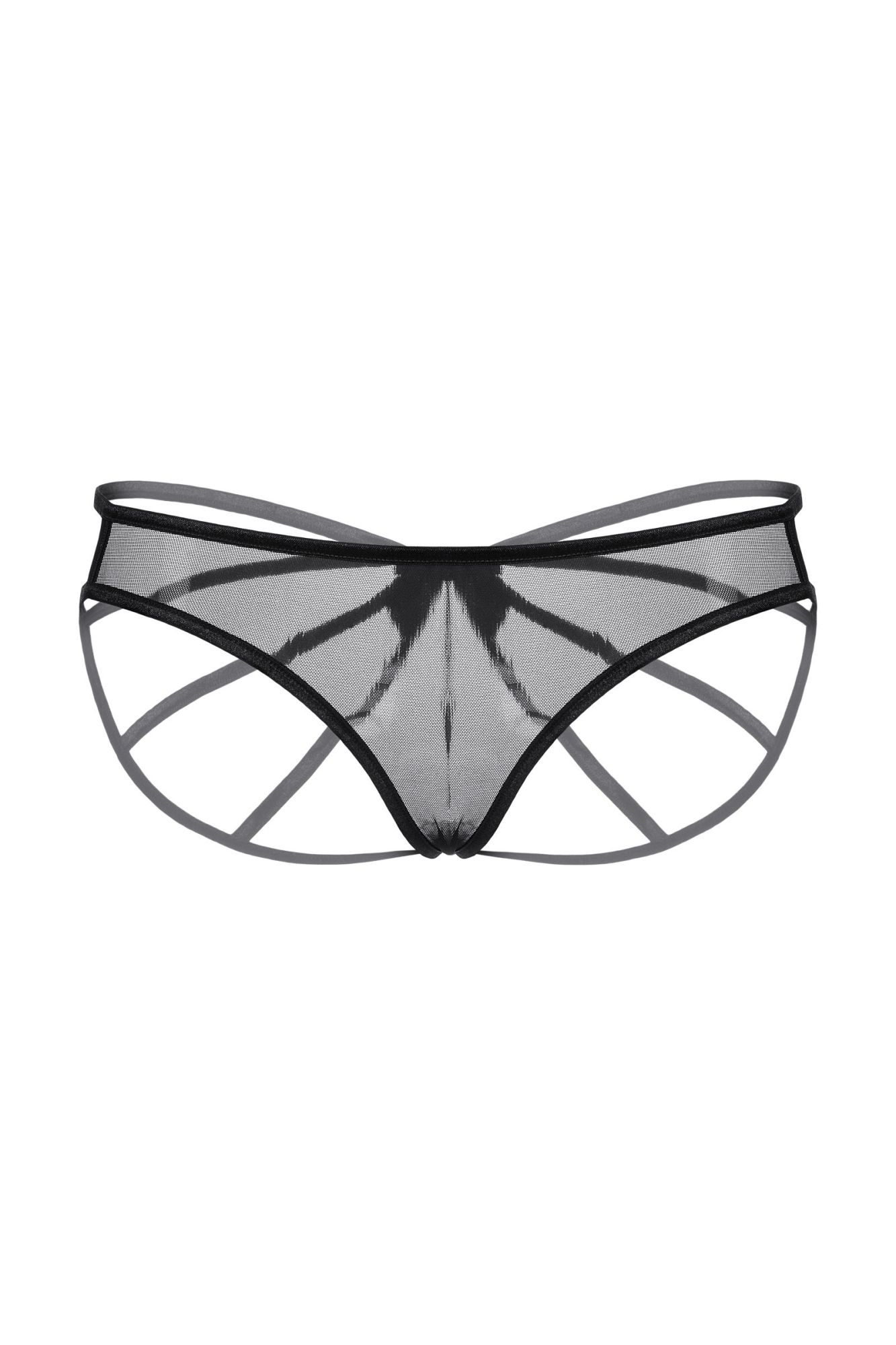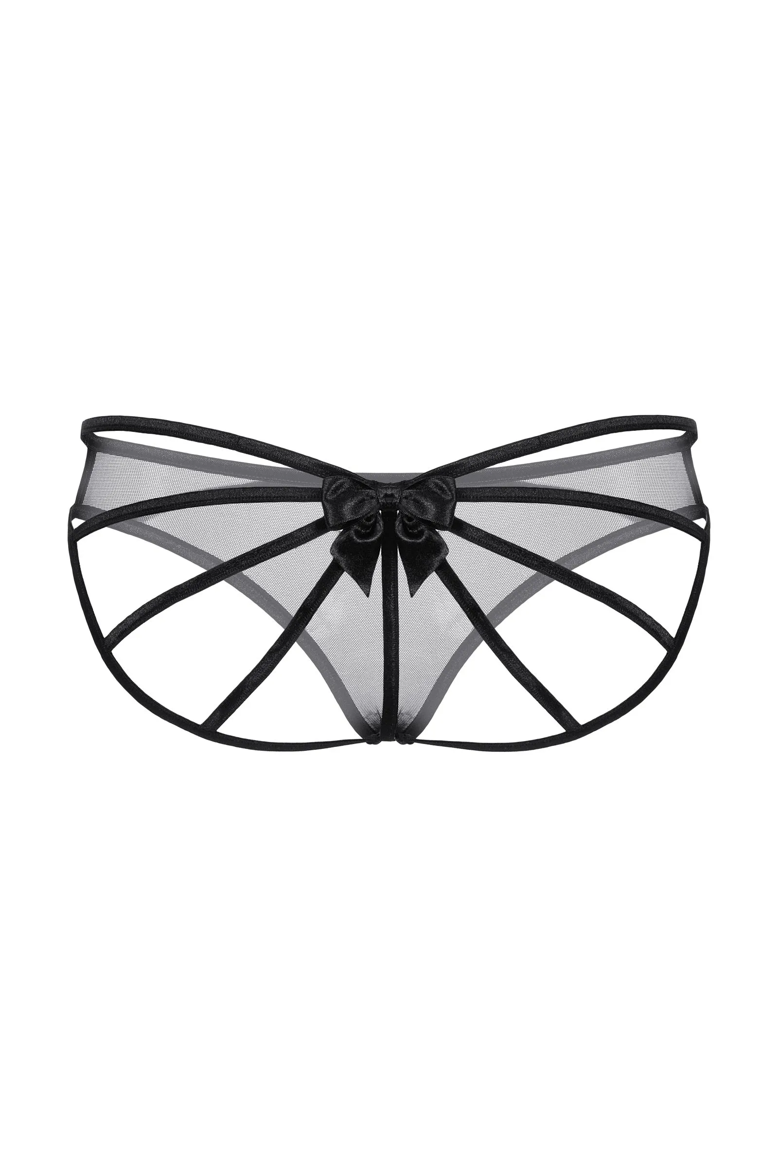 Оригинальные трусики для создания необычного образа. Спереди прозрачная мягкая сеточка, но сзади трусики выполнены оригинальным образом. Переплетение тесьмы увенчано роскошным атласным бантом.