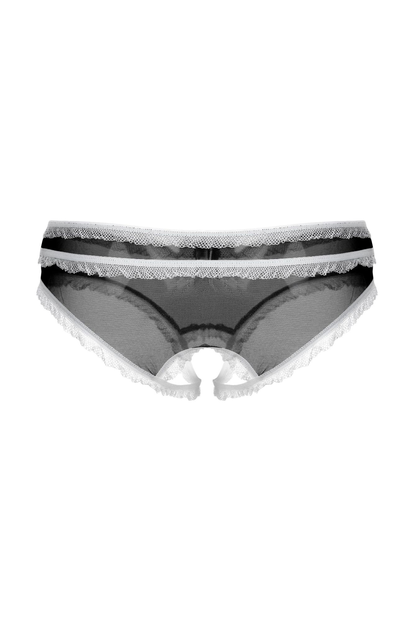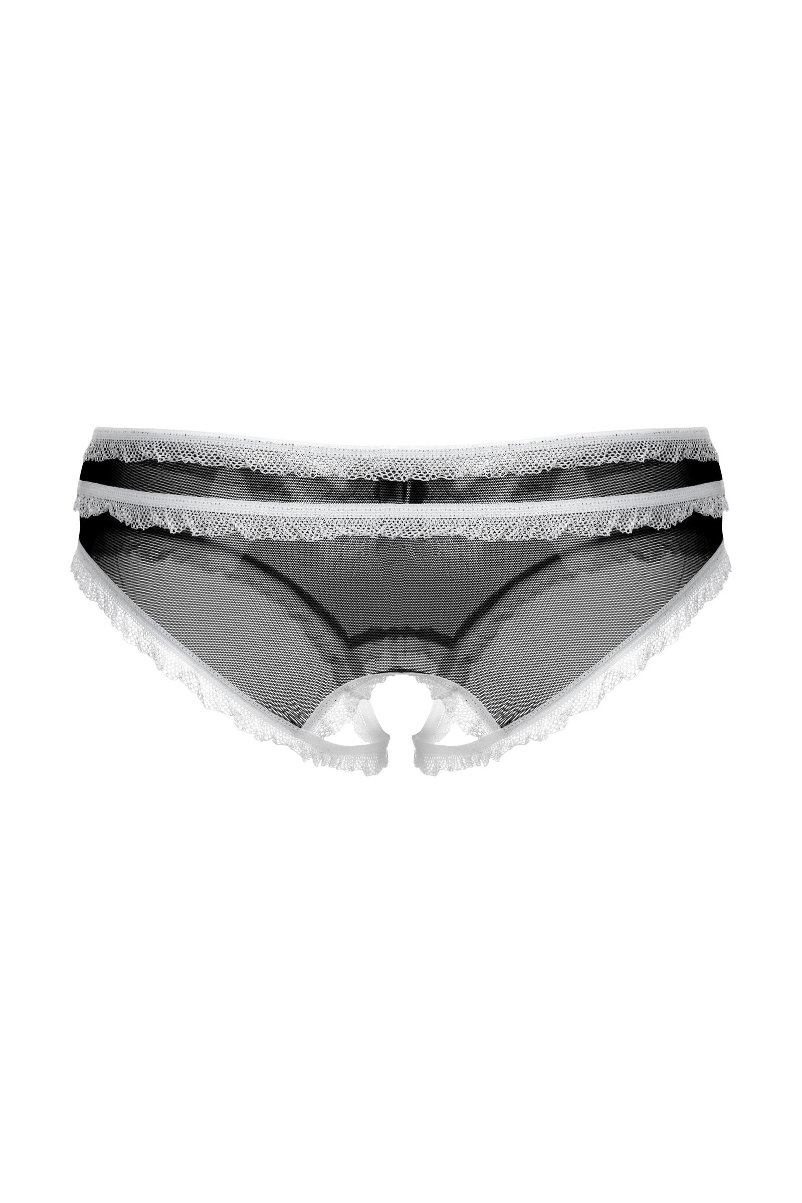 Трусики с открытым доступом. Нежная тонкая черная сеточка в сочетании с белой рюшей и бантиком создают завершенный соблазнительный образ.