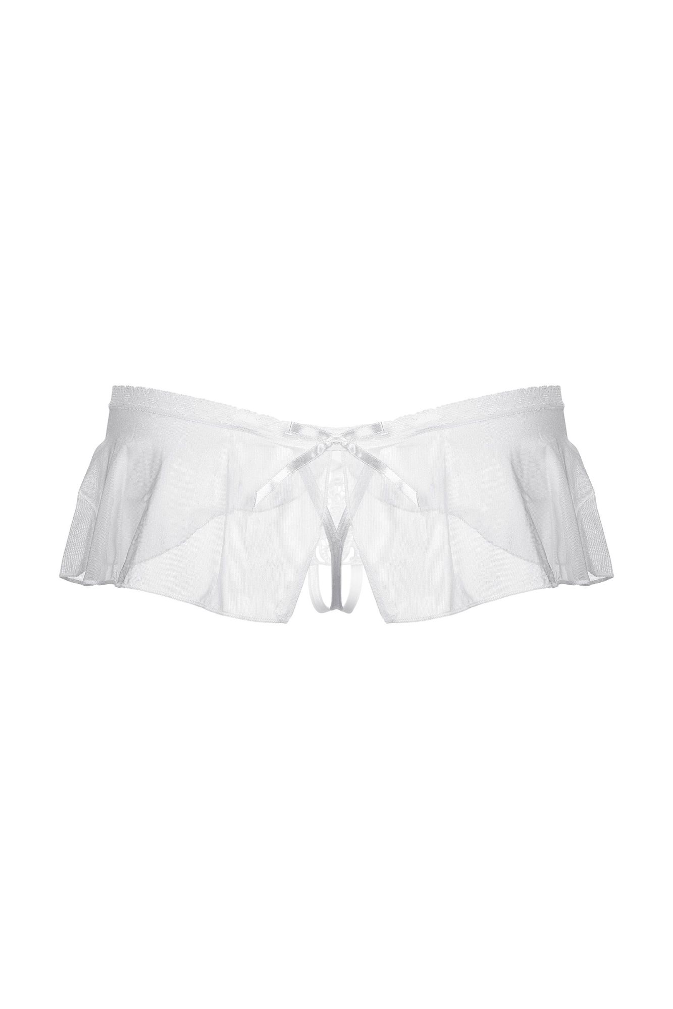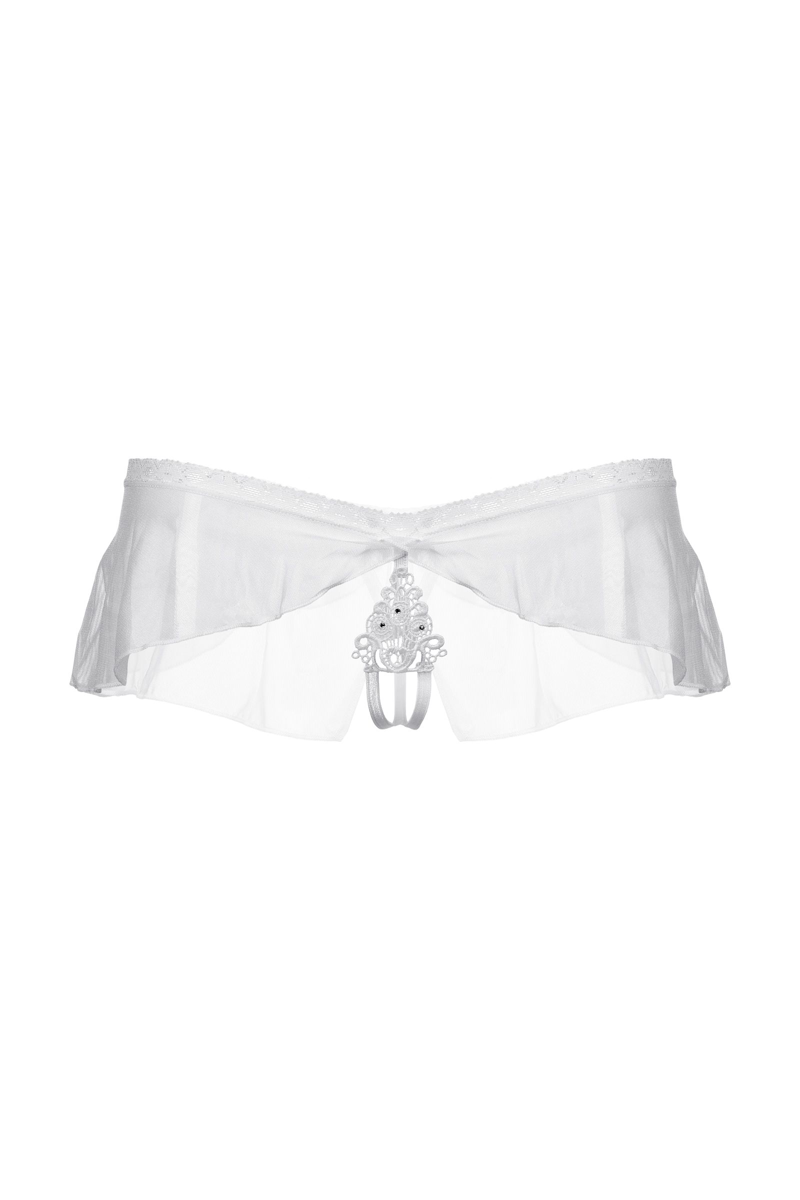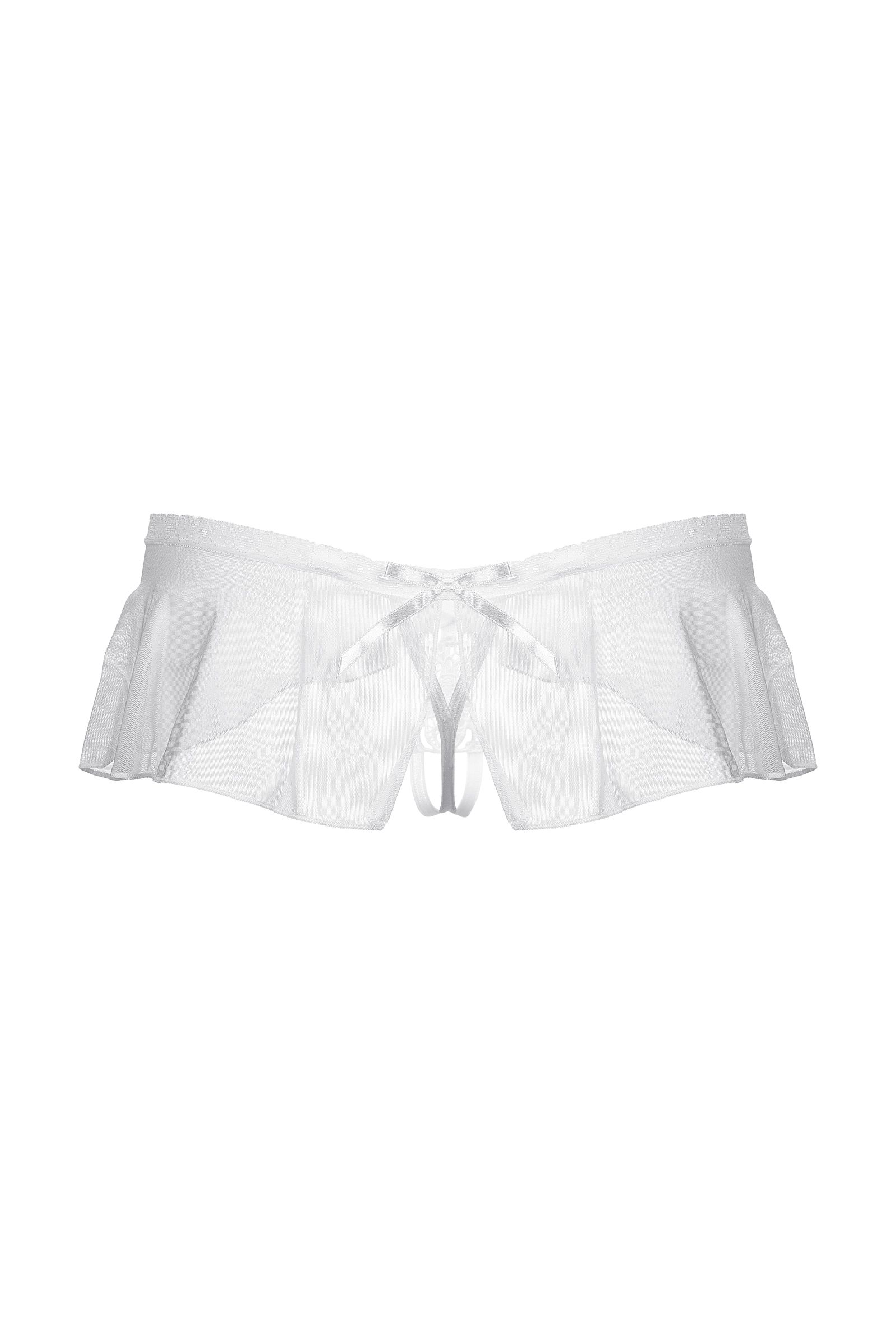 Оригинальные трусики с открытым доступом. Нежное кружево, необычный углубленный верхний край, легкий струящийся тюль и кокетливый бантик сзади создают обольстительный образ.