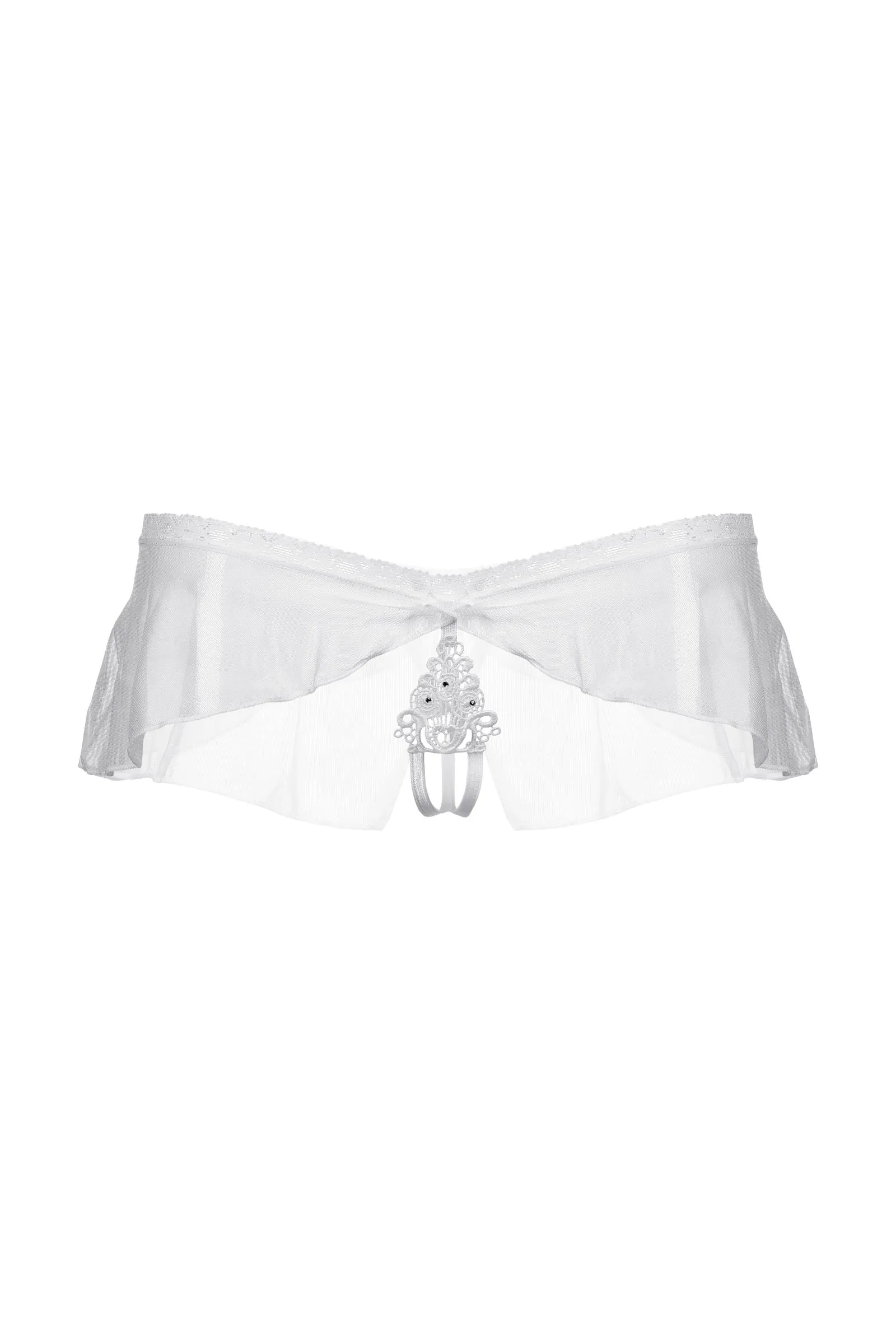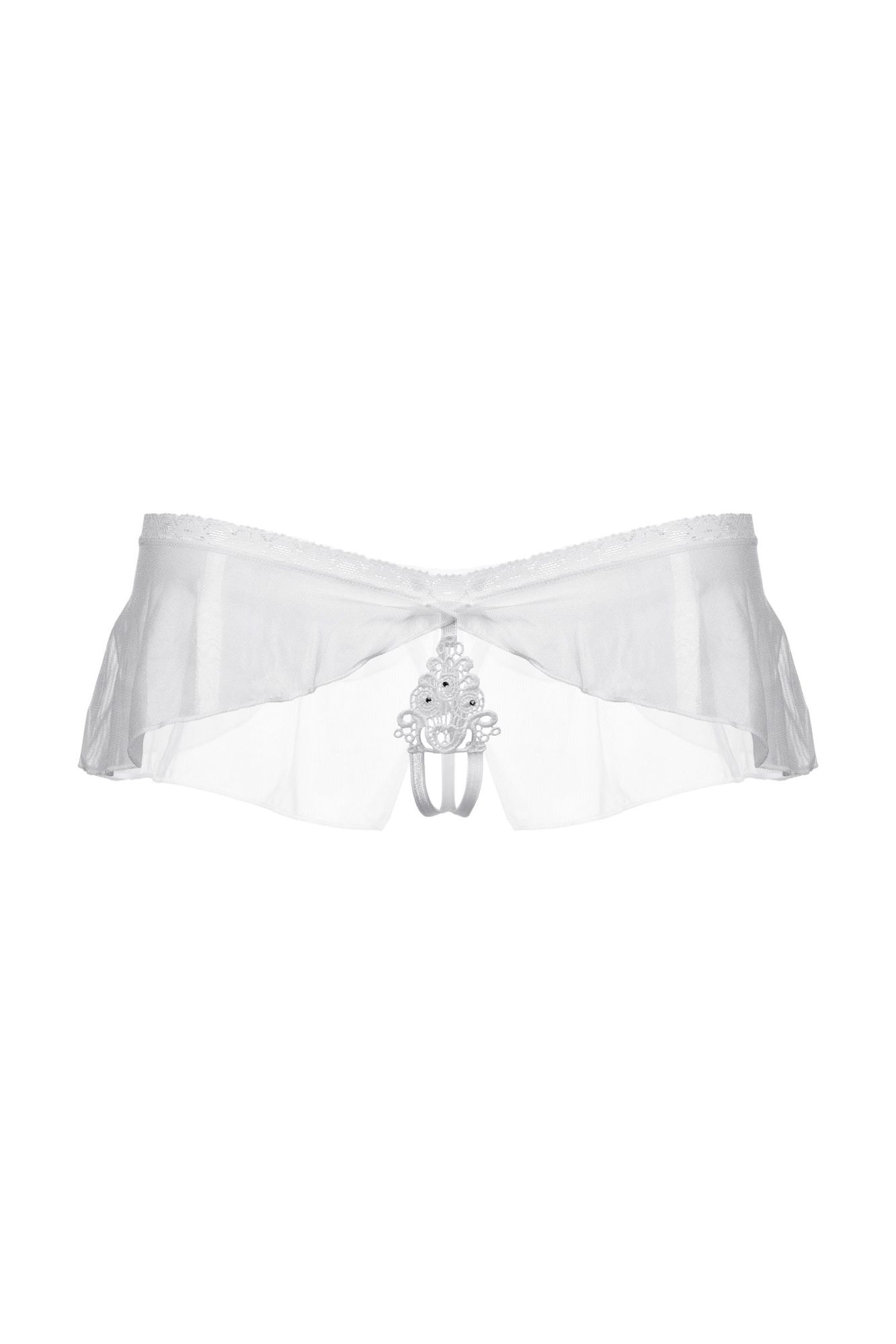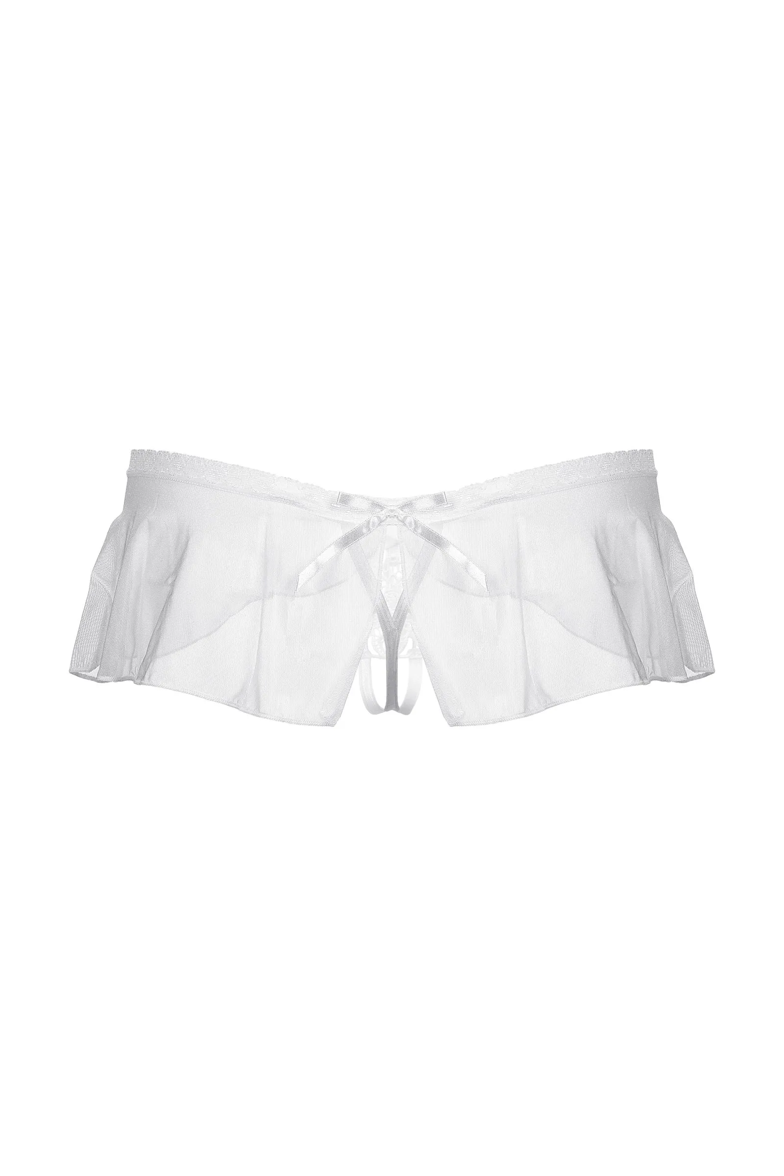 Оригинальные трусики с открытым доступом. Нежное кружево, необычный углубленный верхний край, легкий струящийся тюль и кокетливый бантик сзади создают обольстительный образ.