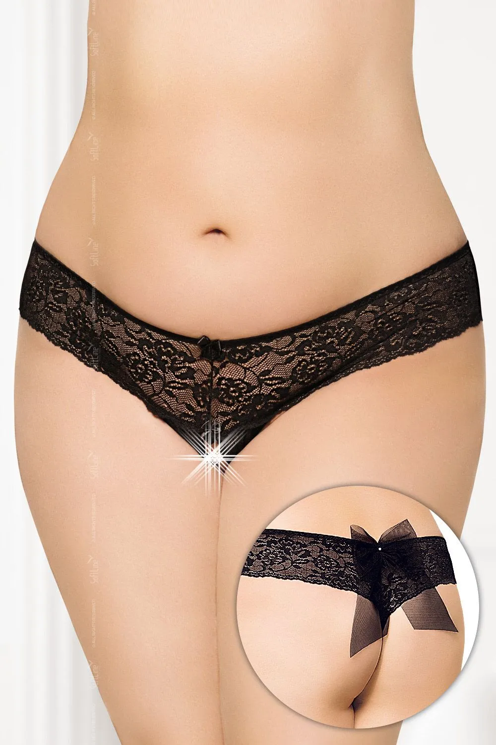 Шикарные кружевные трусики с открытым доступом. Роскошное кружево облегает соблазнительные изгибы бедер и ягодиц. Два маленьких бантика с крошечными бусинами притягивают взгляд. Интригующий бант из тюля, как вишенка на торте, завершает сексуальный образ.