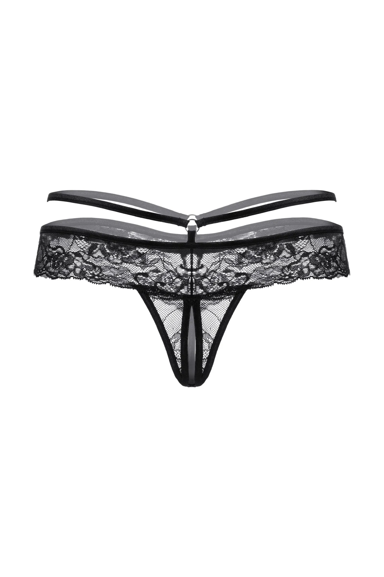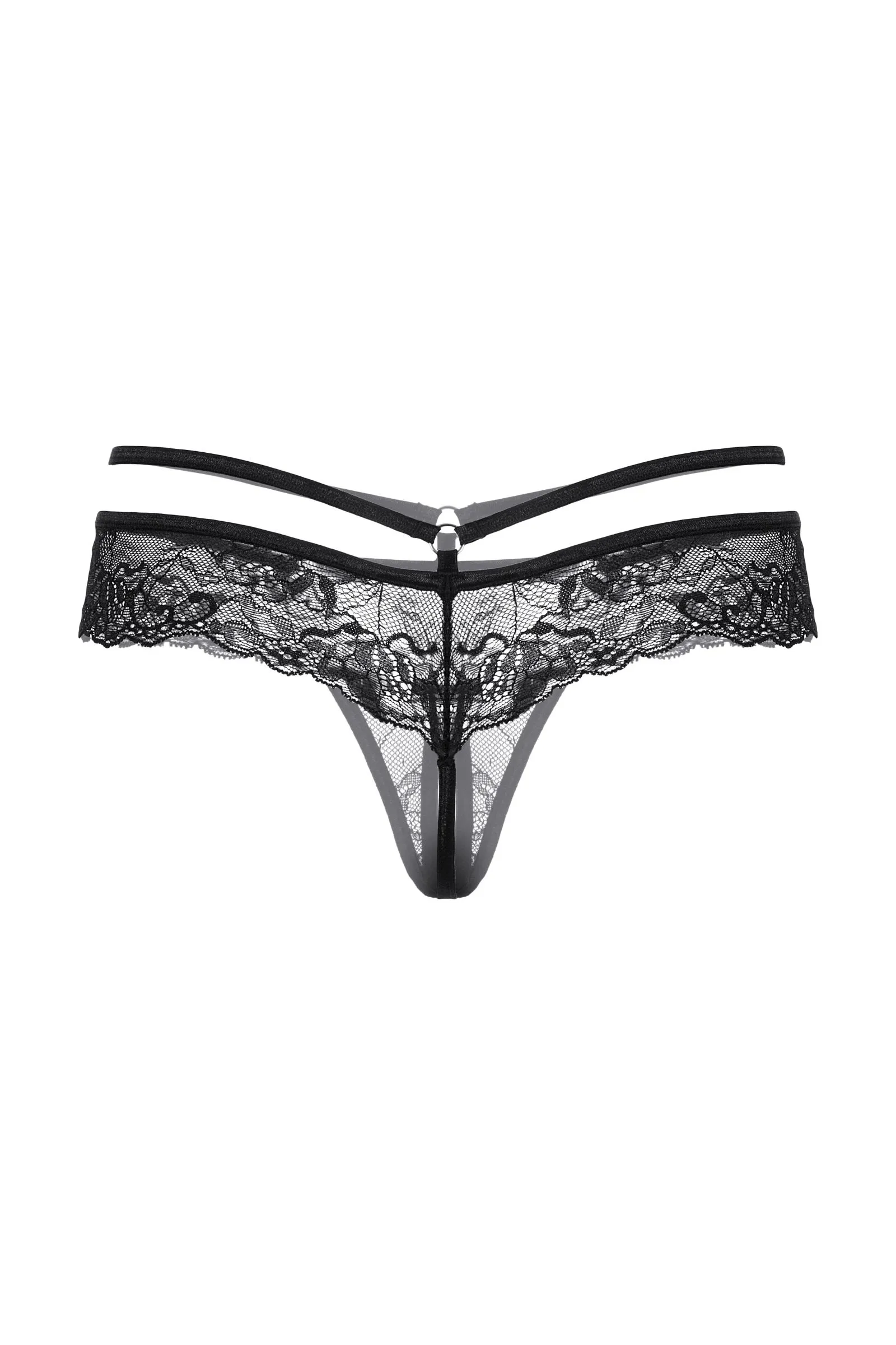 Трусики кружевные с открытым доступом выполнены из роскошного кружева. Тонкая резиночка подчеркивает соблазнительную линию бедер. Спереди декорированы изящным колечком.