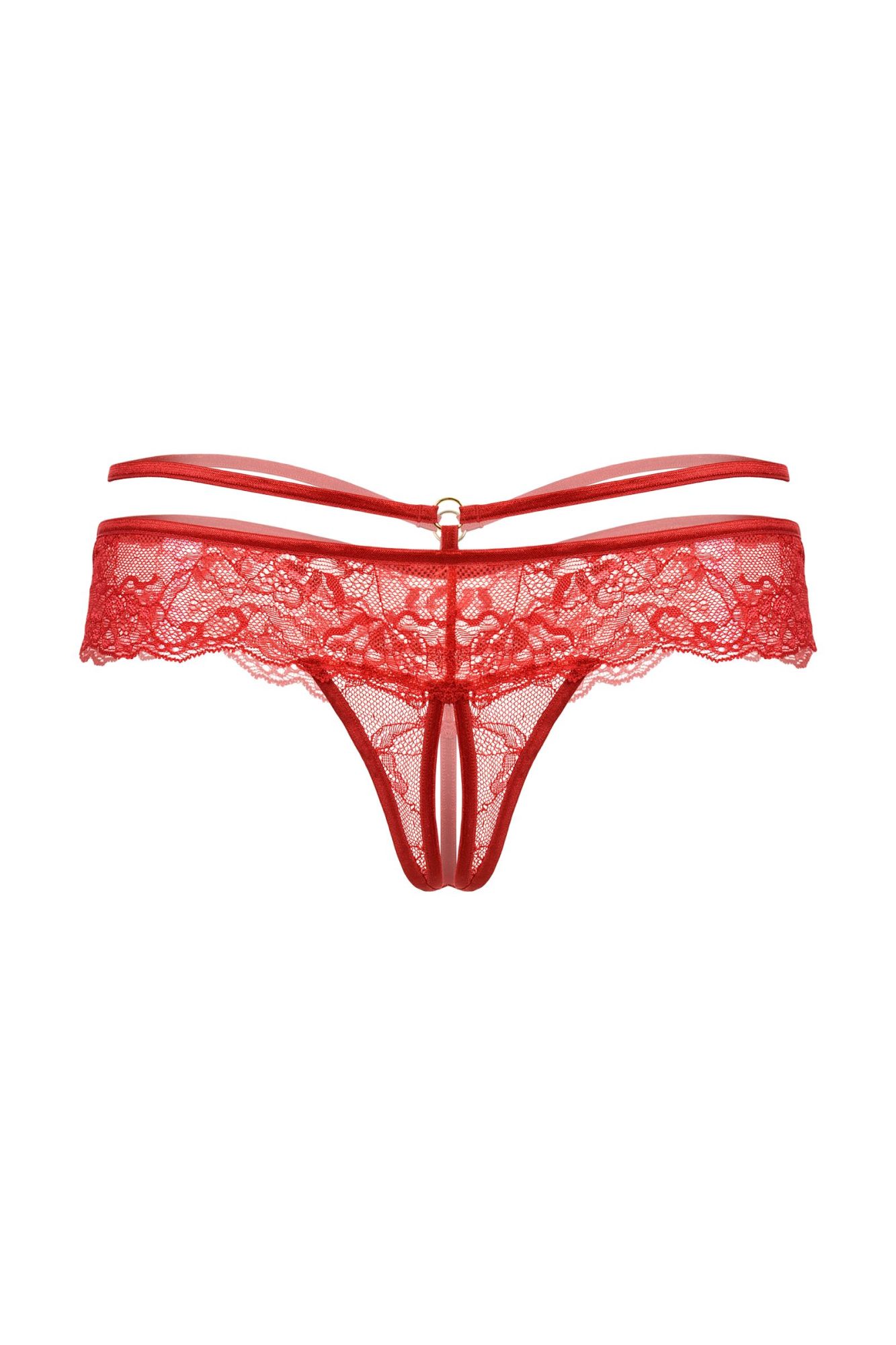 Трусики кружевные с открытым доступом выполнены из роскошного кружева. Тонкая резиночка подчеркивает соблазнительную линию бедер. Спереди декорированы изящным колечком.
