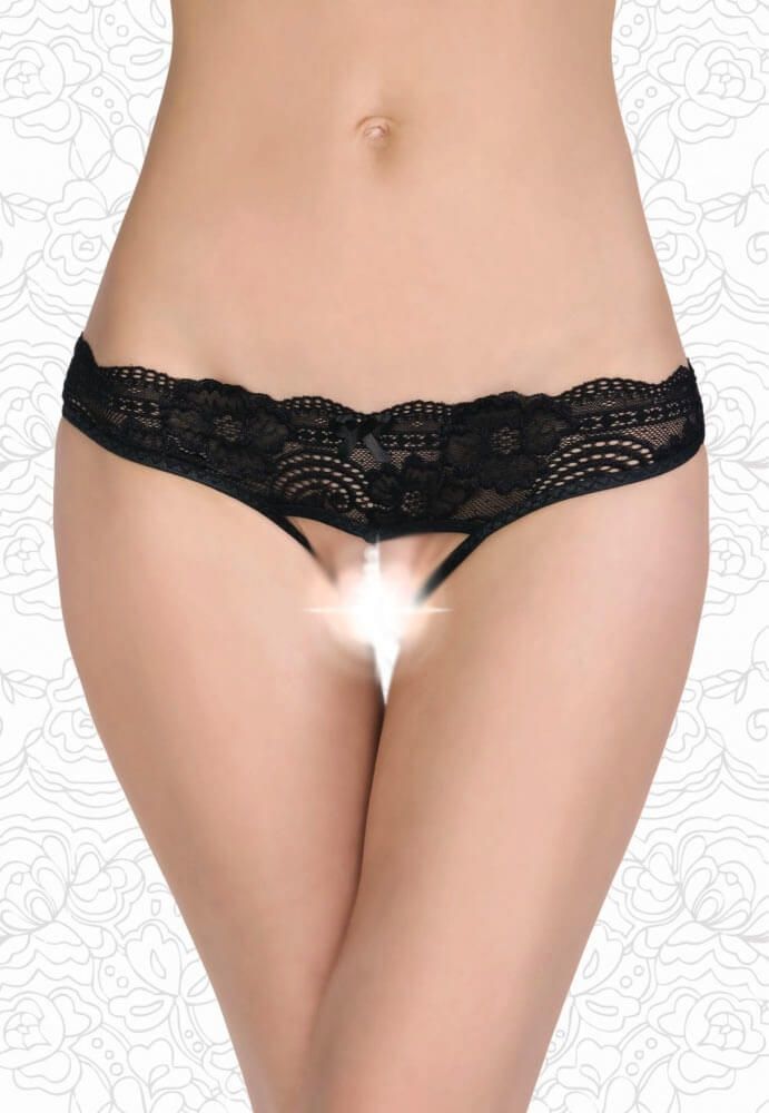 Сексуальные трусики черного цвета с доступом изготовлены из нежнейшего кружева с цветочным узором. Они декорированы игривым бантиком спереди и полосочкой жемчуга, которая провокационно и соблазнительно проходит через промежность.