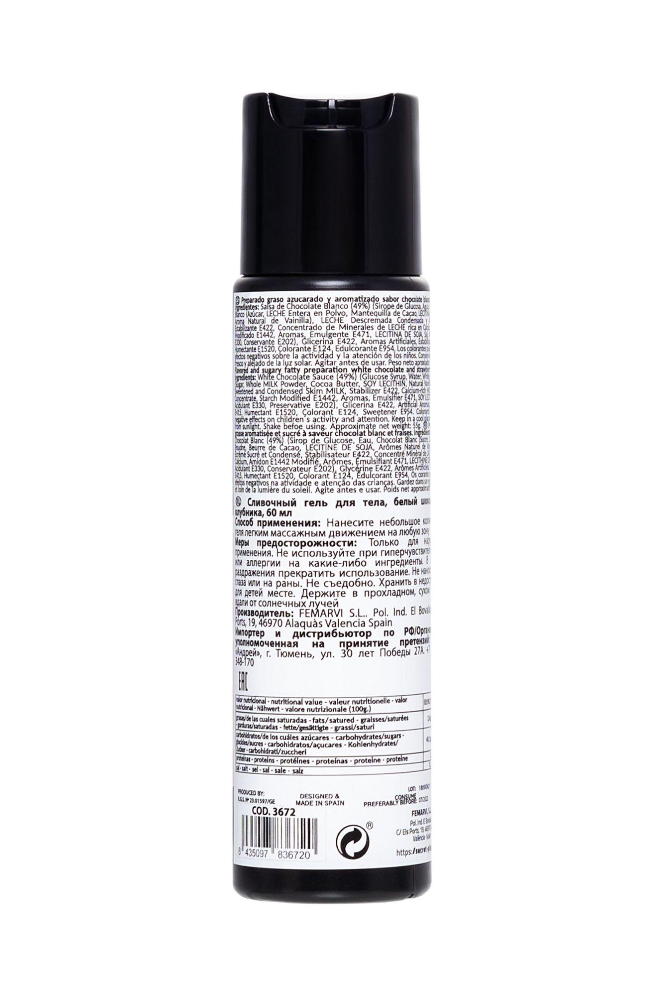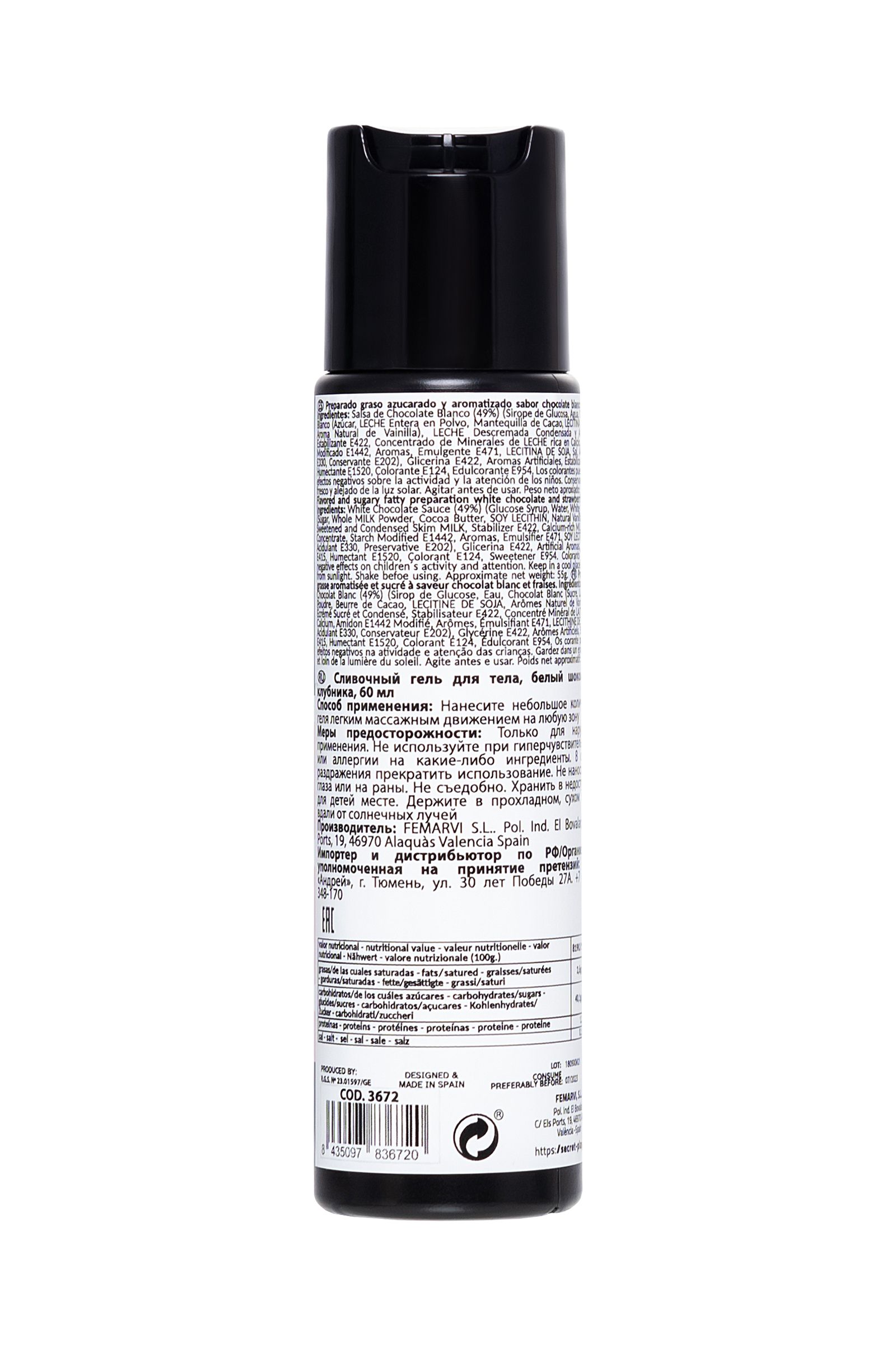 ИНТИМНЫЙ ГЕЛЬ STRAWBERRY & WHITE CHOCOLATE GEL - 60 ML "SWEET LOVE" Сладкая любовь – этот смазывающий гель STRAWBERRY & WHITE CHOCOLATE GEL "SWEET LOVE" идеально подходит для того, чтобы вы таяли от удовольствия. Сладкий и восхитительный аромат клубники и белого шоколада, который заставит вас не переставать облизывать и целовать своего партнера. STRAWBERRY & WHITE CHOCOLATE GEL "SWEET LOVE" - с ним вы можете путешествовать губами по телу вашего партнера, так как они идеально подходят для всех эрогенных зон, сосков, шеи, яичек, ... Кремообразная текстура этого геля обладает превосходными смазочными свойствами. Кроме того, секрет STRAWBERRY & WHITE CHOCOLATE GEL "SWEET LOVE" – идеально подходит для интимного массажа. Добавьте страсти и пикантного огонька в свою сексуальную игру. Гель очарует вас своим восхитительным вкусом клубники и белого шоколада – аромат, перед которым трудно устоять. Емкость с системой «Disc-Top» Простое нанесение Объем: 60 мл (55 г) Вкус: клубника и белый шоколад Глицериновая основа Совместимость с презервативами и игрушками Состав: сахарный и ароматизированный жирный препарат со вкусом белого шоколада и клубники, соус из белого шоколада (49%) (сироп глюкозы, вода, белый шоколад, сахар, сухое цельное молоко, масло какао, соевый лектин, аромат натуральной ванили), сгущенное обезжиренное молоко с сахаром, стабилизатор e422, богатый кальцием молочный минеральный концентрат, модифицированный крахмал e1442, ароматизаторы, эмульгатор e471, соевый лектин, соль, подкислитель e330, консервант e202), глицерин e422, искусственные ароматизаторы, стабилизатор e415, увлажнитель e1520, краситель e124, подсластитель e954. Способ применения: Нанесите массирующими движениями на желаемую область. Меры предосторожности: Не используйте при гиперчувствительности или аллергии на какие-либо ингредиенты. В случае раздражения прекратить использование. Не наносите на глаза или на раны. Хранить в недоступном для детей месте. Держите в прохладном, сухом месте, вдали от солнечных лучей.