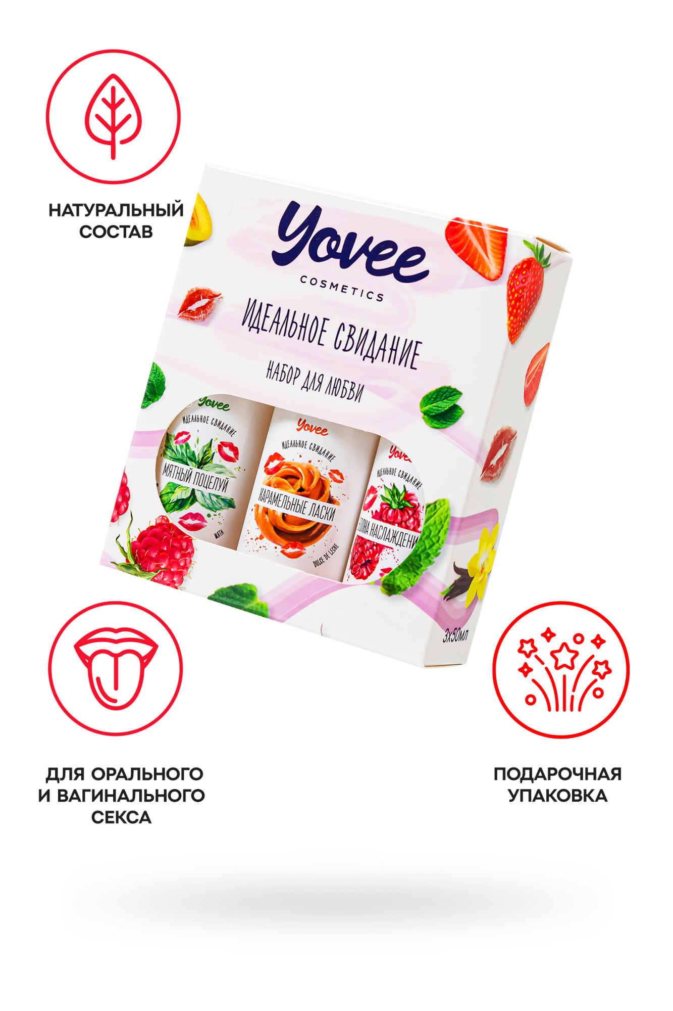 "Набор для любви" от бренда Yovee идеально подходит для эротических экспериментов. В одной упаковке три съедобных геля на водной основе. Первый обладает сочным вкусом и ароматом малины, второй - соблазнительной мяты, третий - карамельно-сливочной нежностью с волнующими нотами ванили. Используйте самостоятельно или создайте свой вкус! Несмотря на сладость, гели не содержат сахара в составе, не нарушают микрофлору и pH-баланс. Подходят как для вагинального, так и для орального секса. Совместимы со всеми видами презервативов и игрушек для взрослых. ИДЕАЛЬНЫЙ ПОДАРОК ВОЗМОЖНОСТЬ СОЗДАТЬ СВОЙ ВКУС Все гели Yovee имеют простой и безопасный состав: вода; гидроксиэтилцеллюлоза - стабилизатор эмульсий, регулятор вязкости; Д-пантенол защищает слизистые, запускает процесс регенерации тканей; сорбат калия и бензоат натрия – безопасные пищевые консерванты, разрешенные в натуральной и органической косметике; лимонная кислота помогает поддерживать оптимальный уровень рН, является естественным консервантом. БЕЗ ГЛИЦЕРИНА БЕЗ ПАРАБЕНОВ БЕЗ КРАСИТЕЛЕЙ БЕЗ САХАРА Комплектация: 721002 Съедобная гель-смазка Yovee «Волна наслаждения» с Д-Пантенолом, со вкусом малины, 50 мл 721006 Съедобная гель-смазка Yovee «Мятный поцелуй» с Д-Пантенолом, со вкусом мяты, 50 мл 721014 Съедобная гель-смазка Yovee «Карамельные ласки» с Д-Пантенолом, со вкусом «Dulce de Leche», 50 мл