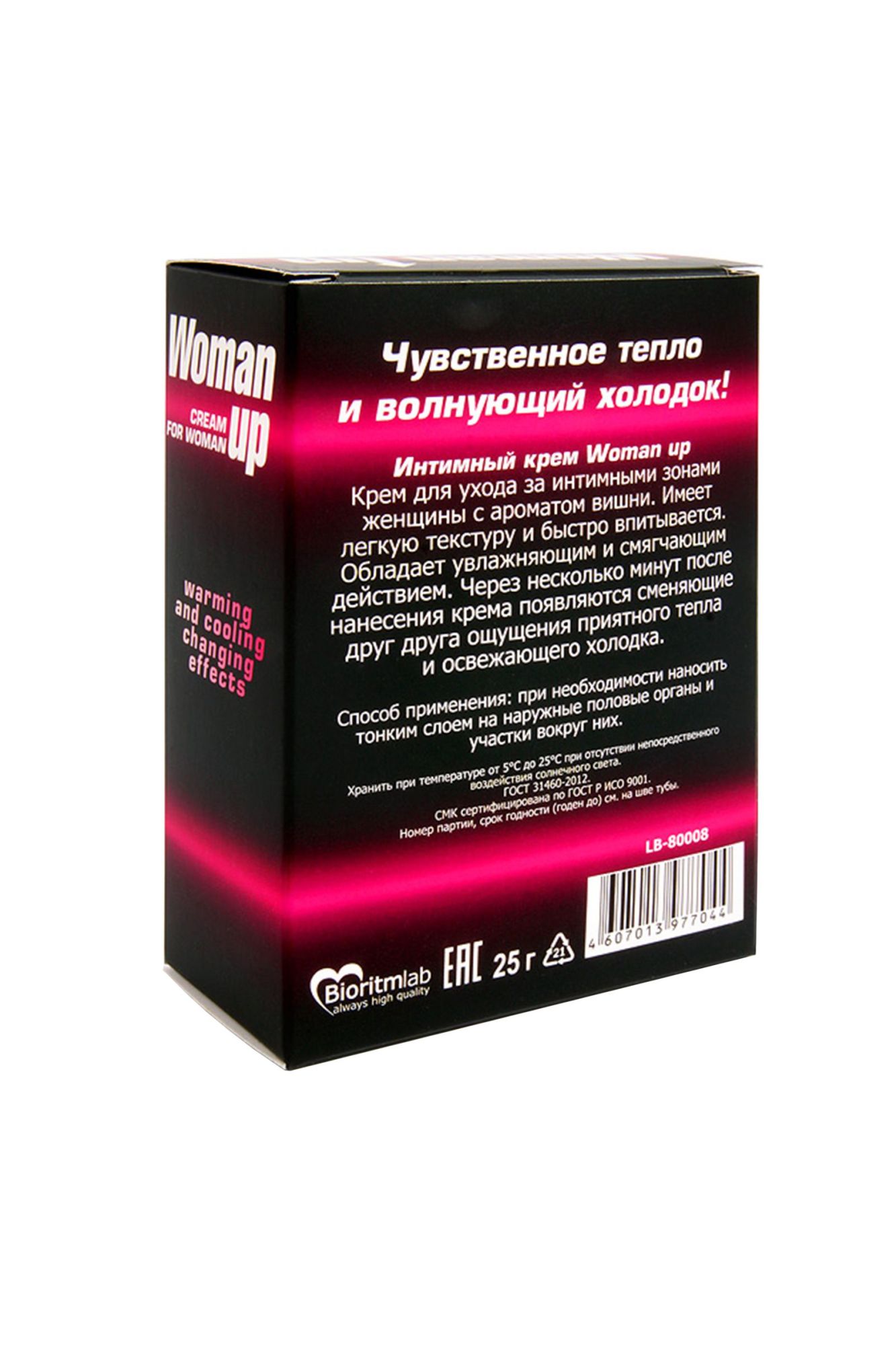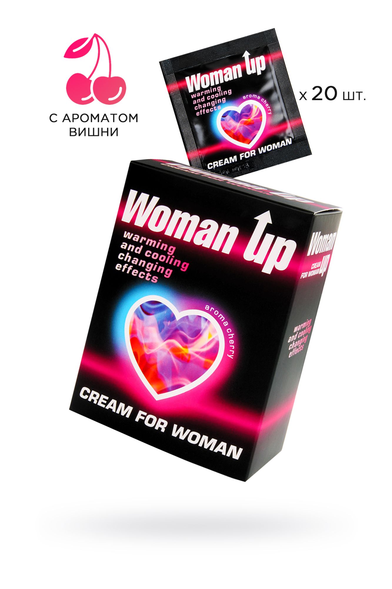 Лед и пламя… На что ты решишься, чтобы испытать новые сексуальные ощущения? Попробуй стимулирующий крем WOMAN UP с потрясающим ароматом вишни. С этим кремом ты можешь позволить себе пробудить дикую страсть и первобытные желания. Вмассируй небольшое количество крема в головку клитора во время прелюдии. Через пару минут ты ощутишь приятное тепло, разливающееся по всей чувствительной зоне, а затем морозную свежесть, как поцелуй ледяного ветра, а затем снова пекущее тепло. Этот невероятный танец между двух стихий поможет тебе достичь оргазма потрясающей силы. Сменяющие друг друга ощущения пробуждают чувственность и страсть как в соло игре, так и в занятии любовью с партнером. Увлажняющий и смягчающий крем WOMAN UP даст огня твоему телу и пробудит свою внутреннюю Богиню. Способ применения: перед интимной близостью нанести небольшое количество крема на клитор. Дозировка подбирается индивидуально, начиная с 1 капли размером с маленькую горошину. При необходимости количество стимулятора можно увеличивать. Возможна индивидуальная гиперчувствительность. Не допускать попадания в глаза, на раздраженную или поврежденную кожу. Состав: Aqua, PEG-8, Polydimethylsiloxane, Wax Emulsifying, Caprylic/Capric Triglyceride, Menthyl Lactate, Methylparaben, Arginine, Acrylates/C 10-30 Alkyl Acrylate Crosspolymer, Propylparaben, Vanillyl Butyl Ether, Rubrum Piperis Extract, Parfum. Объем: саше 1,5 г, 20 шт в упаковке