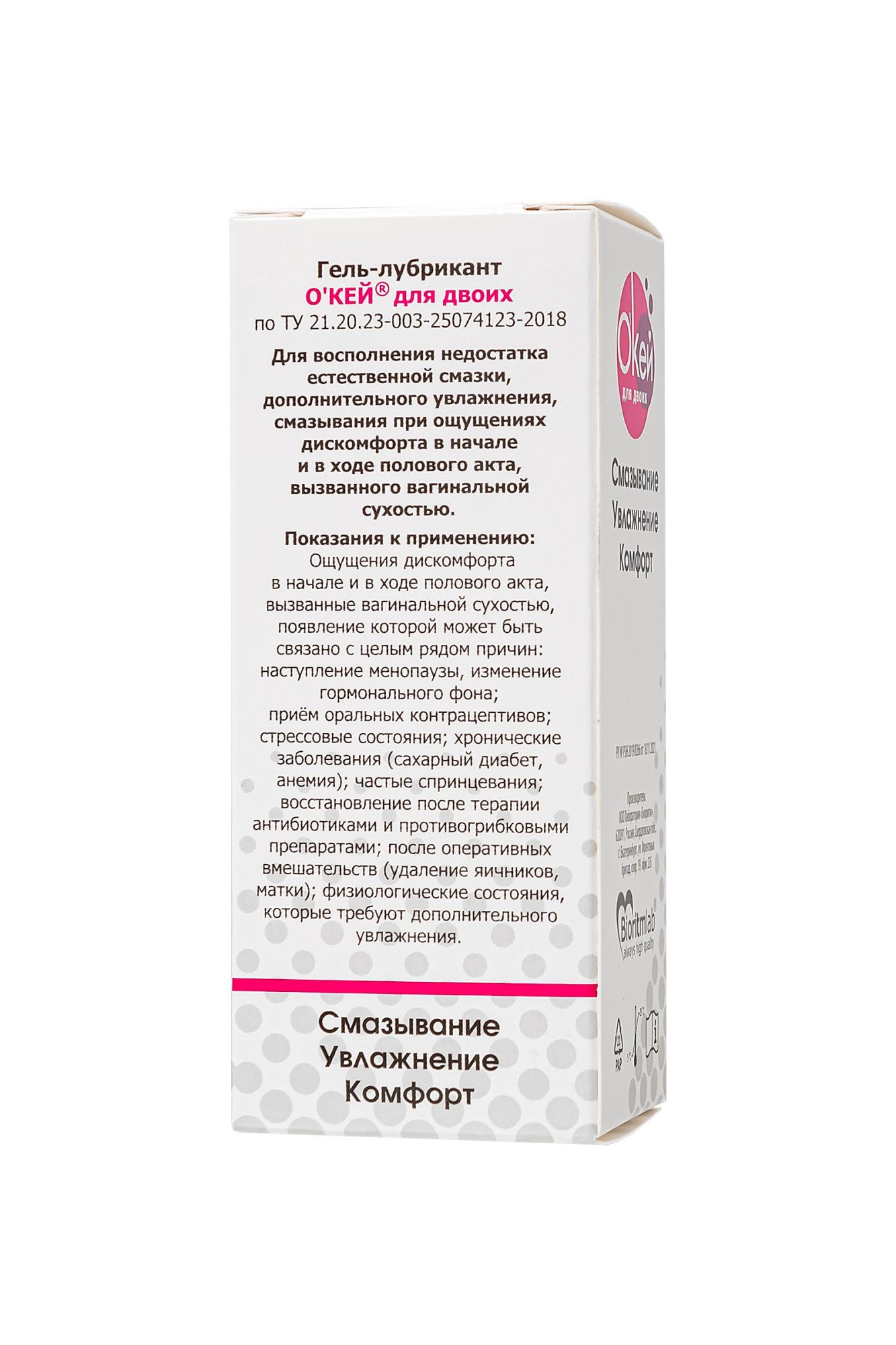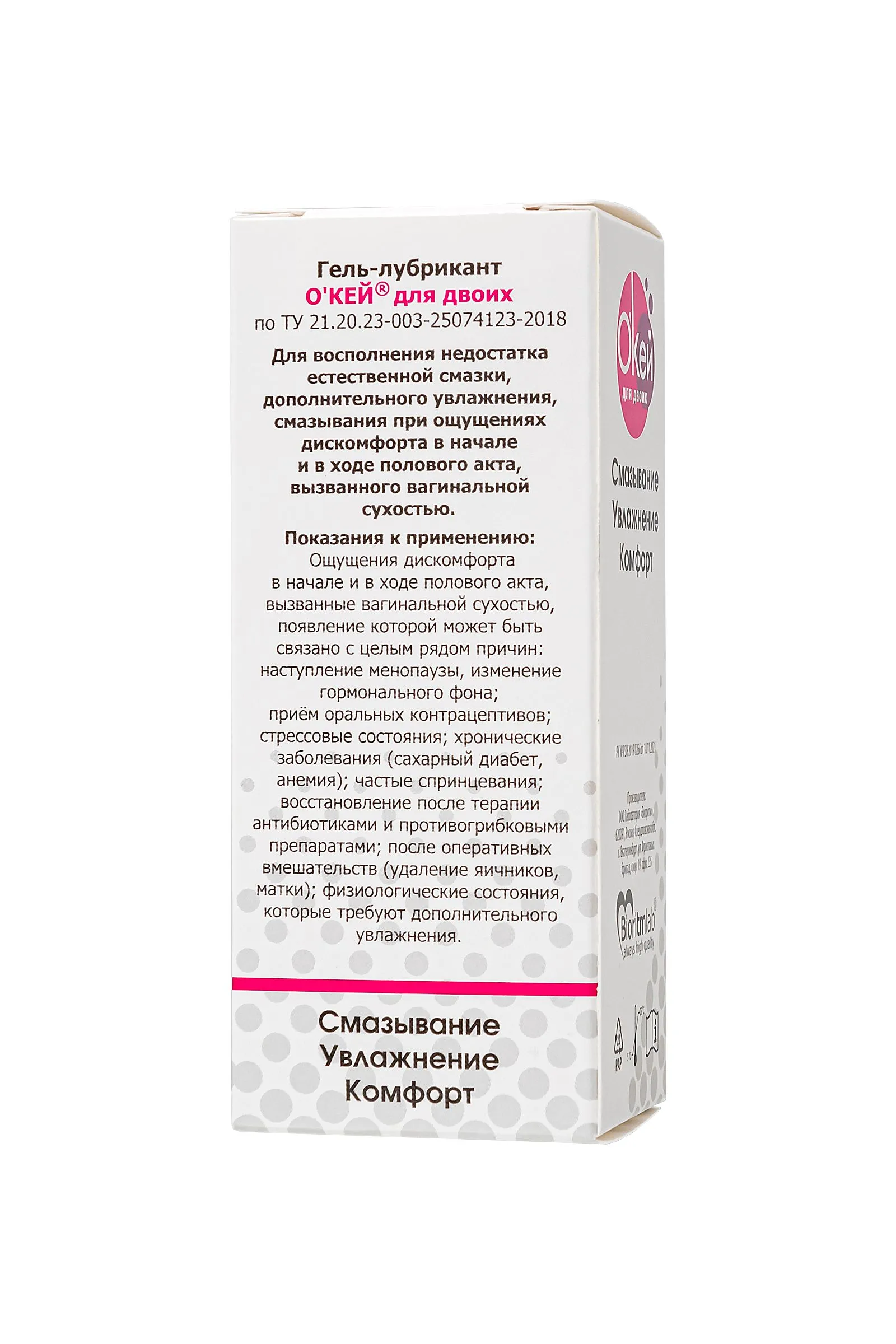 Превратите ваши интимные моменты в настоящее удовольствие с гелем-лубрикантом на водной основе "О'КЕЙ для Двоих". Ведь недостаток естественной смазки не должен быть помехой на пути к наслаждению. Этот классический лубрикант на водной основе создан, чтобы сделать ваш секс комфортным и приятным. Интенсивное увлажнение: С этим лубрикантом вы забудете о неприятных ощущениях благодаря его высокой степени увлажнения. Долговременное скольжение: Надежное скольжение на протяжении всего полового акта обеспечивает комфорт и удовлетворение. Одобрено гинекологами: Разработан с учетом здоровья и безопасности. Подходит для большинства людей благодаря нейтральной формуле – не имеет запаха, цвета, вкуса. Не пачкает: Смазка легко впитывается, не оставляя следов и липкости на вашей одежде. Совместимость с презервативами и секс-игрушками: Никаких ограничений в ваших интимных предпочтениях. Способ применения: Нанесите небольшое количество геля-лубриканта "О'КЕЙ для Двоих" на половые органы перед интимной близостью. Этот шаг поможет вам наслаждаться каждым мгновением без дискомфорта.