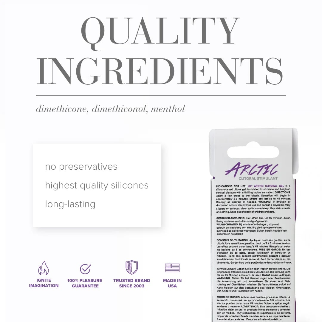 Возбуждающий гель для клитора сильного действия JO Arctic - возбуждающее средство, которое добавляет ощущений. Создан женщинами для женщин. Не содержит аминокислот. Возбуждающее средство безопасно для использования с презервативами.