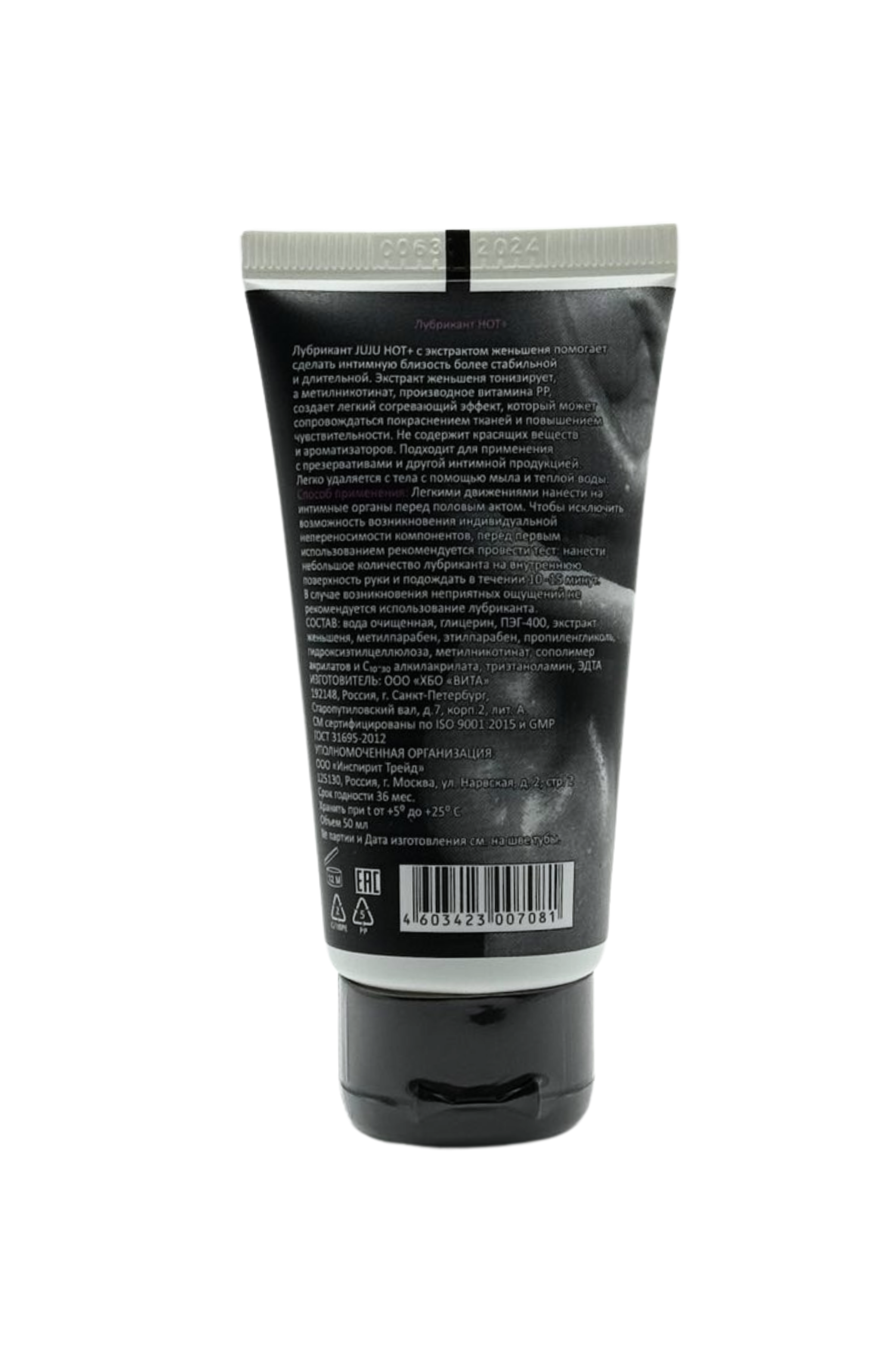 Лубрикант JUJU HOT+ с экстрактом женьшеня обладает возбуждающим эффектом. Экстракт женьшеня тонизирует, а метилникотинат, производное витамина РР, улучшает микроциркуляцию и создает легкий согревающий эффект, который может сопровождаться покраснением тканей и повышением чувствительности. Не содержит красящих веществ и ароматизаторов. Лубрикант совместим с презервативом и другой интимной продукцией. Легко смывается мыльной водой. Состав: вода очищенная, глицерин, ПЭГ-400, экстракт женьшеня, метилпарабен,этилпарабен в пропиленгликоле, гидроксиэтилцеллюлоза, метилникотинат, сополимер акрилатов, ЭДТА. Срок годности- 3 года.