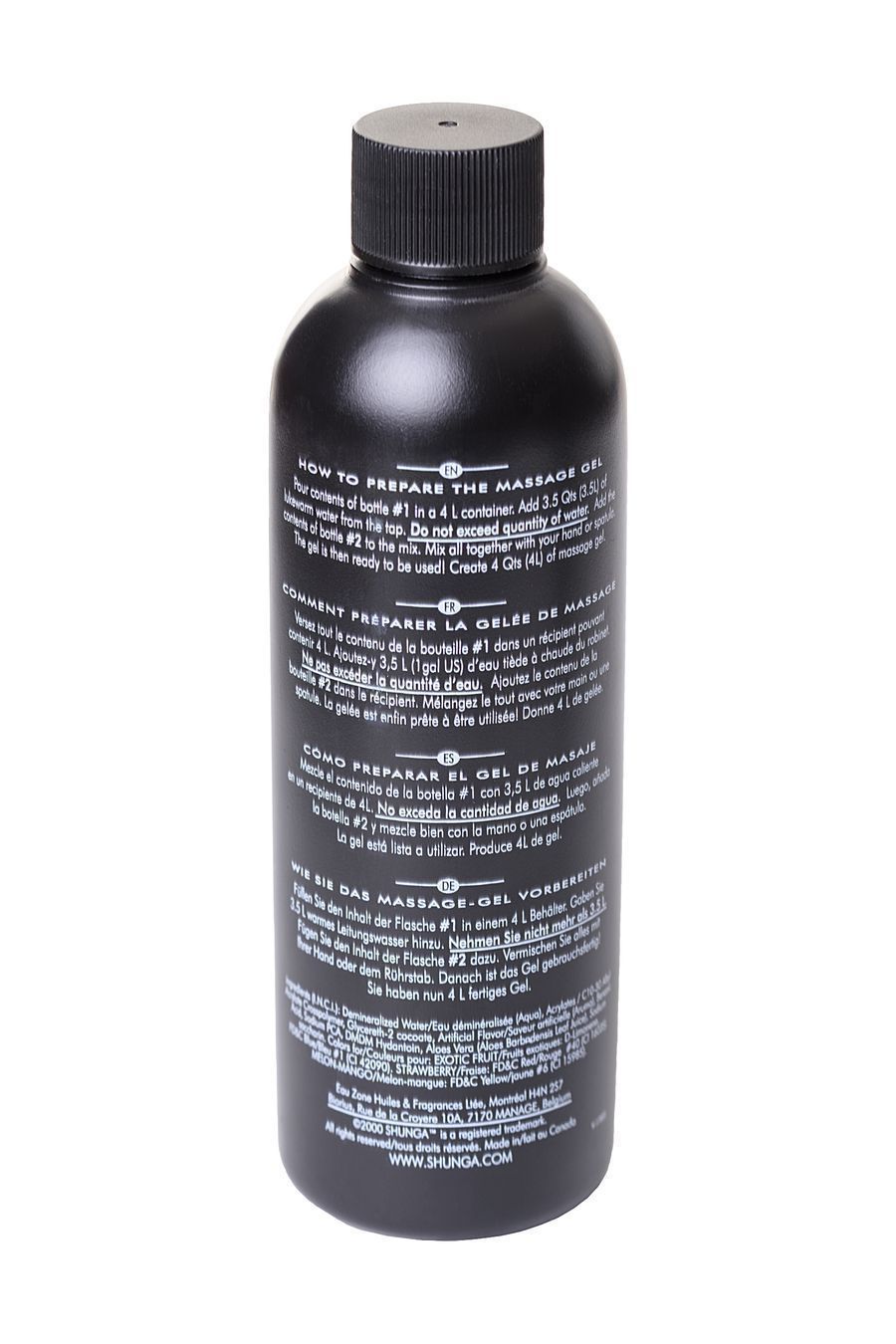 Приготовление геля: Налейте 3,5 литра теплой воды и содержимое бутылочки №1 в любую емкость. Добавьте бутылочку №2 и хорошо перемешайте. Вы получите 4 литра массажного геля.