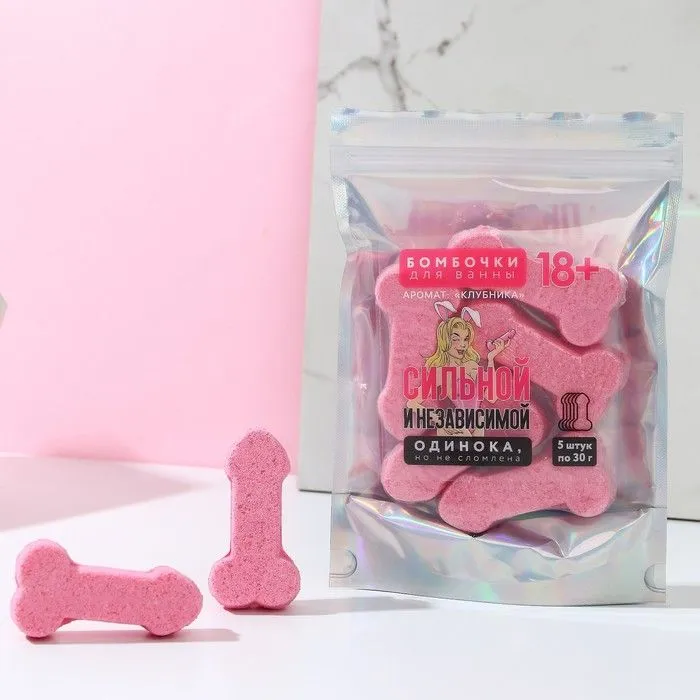 Бурлящие бомбочки в виде члена разнообразит прием ванны. Сувенир в виде мужского достоинства 7 см в длину и весом 30 г взбудоражит фантазию, а сладкий аромат подарит приятные ощущения.