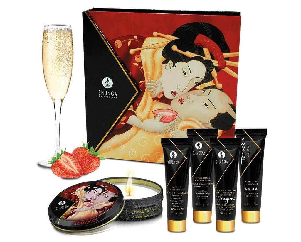 В набор Shunga Geisha's Secrets Sparkling Strawberry Wine входят:
