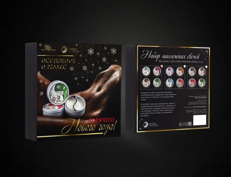 Массажные свечи отличаются от обычных тем, что при таянии воска от пламени появляется массажное масло, с нежным ароматом. Набор Искушение и релакс подарит паре нежный разогревающий массаж с натуральными маслами.