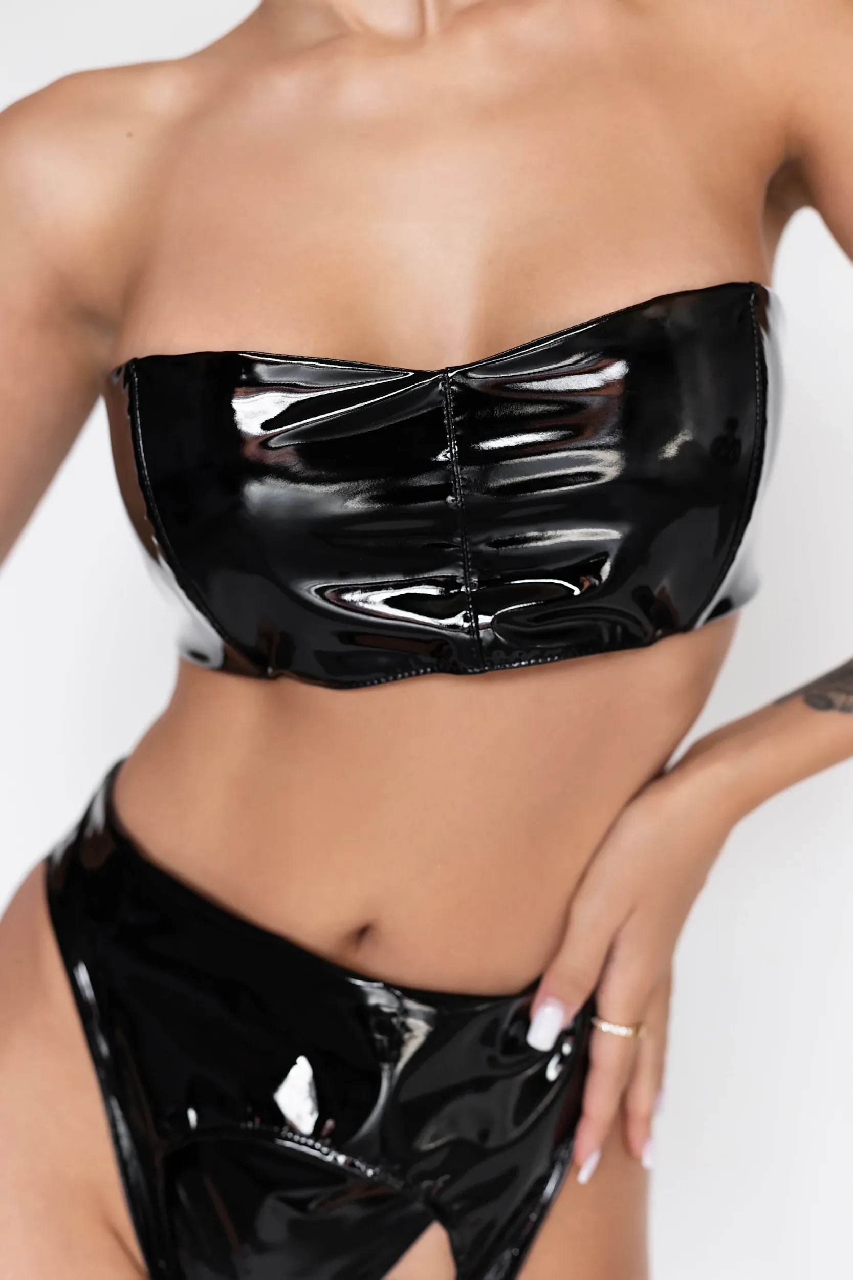 Сексуальный блестящий комплект из винила придаст вашим забавам оттенок БДСМ. А если дополните ещё и БДСМ аксессуарами, то игры могут стать ещё откровенней и жарче.