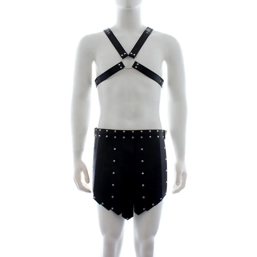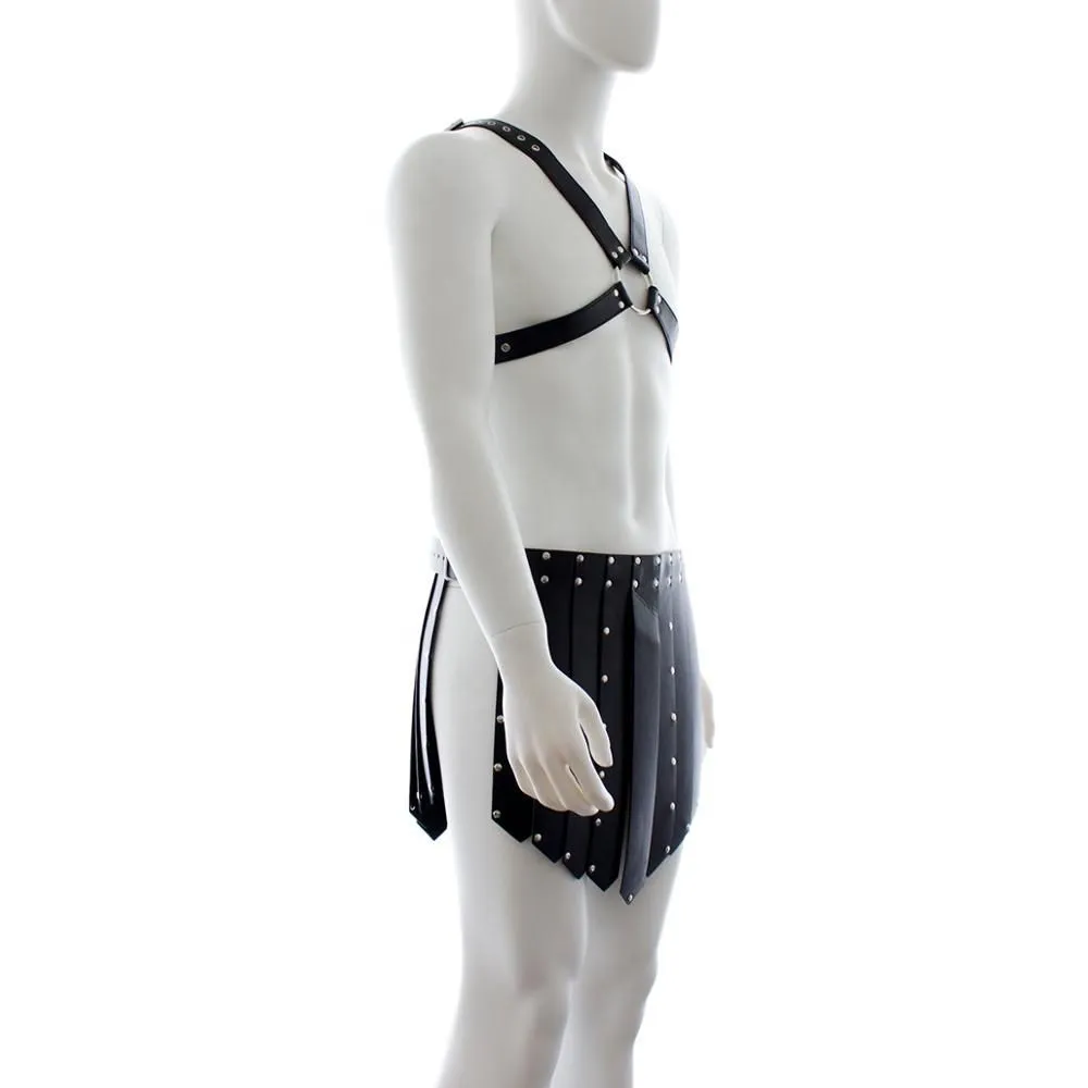 Мужской костюм от бренда Lapin Rose состоит из портупеи и повязки гладиатора, сделанных из имитирующего кожу полиуретана. Они декорированы металлической фурнитурой, которая добавляет комплекту брутальности. В зависимости от используемых аксессуаров, такой костюм позволит примерить на себя роль властного и не терпящего возражений мужчины или покорного раба. С плеткой в руках образ будет угрожающим и сексуальным, но с кляпом во рту или в ошейнике Вы будете желанной забавой для своей госпожи.