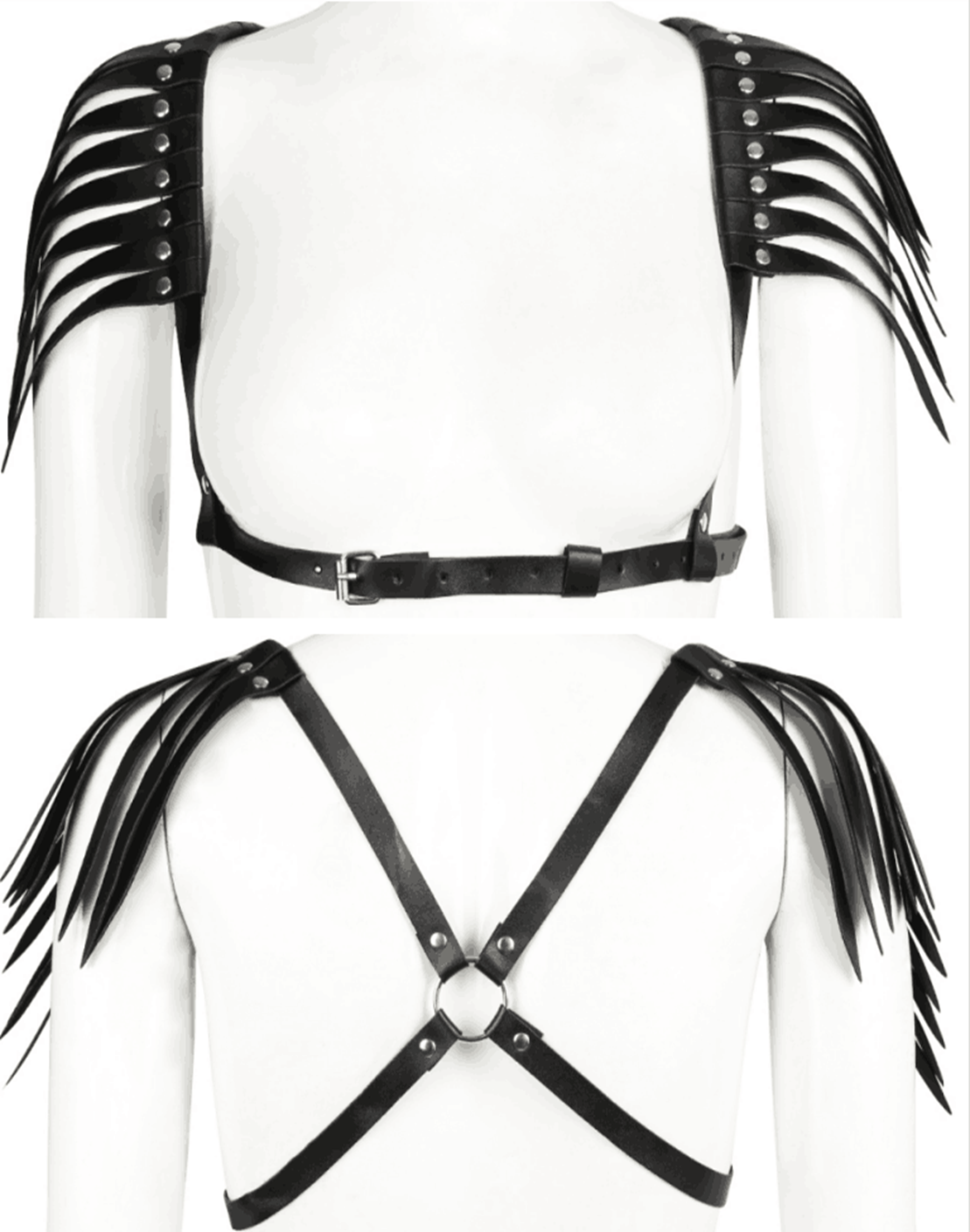 Портупея прекрасно дополнит любой образ, которому хочется придать особый стиль и воинственность. Аксессуар будет гармонично смотреться с различными стилями одежды, выразительно подчеркивая Вашу индивидуальность. Портупея создана из нескольких ремней, соединенных между собой при помощи металлических колец. Портупея изготовлена из экокожи черного цвета, а вся фурнитура выполнена из нержавеющей стали.