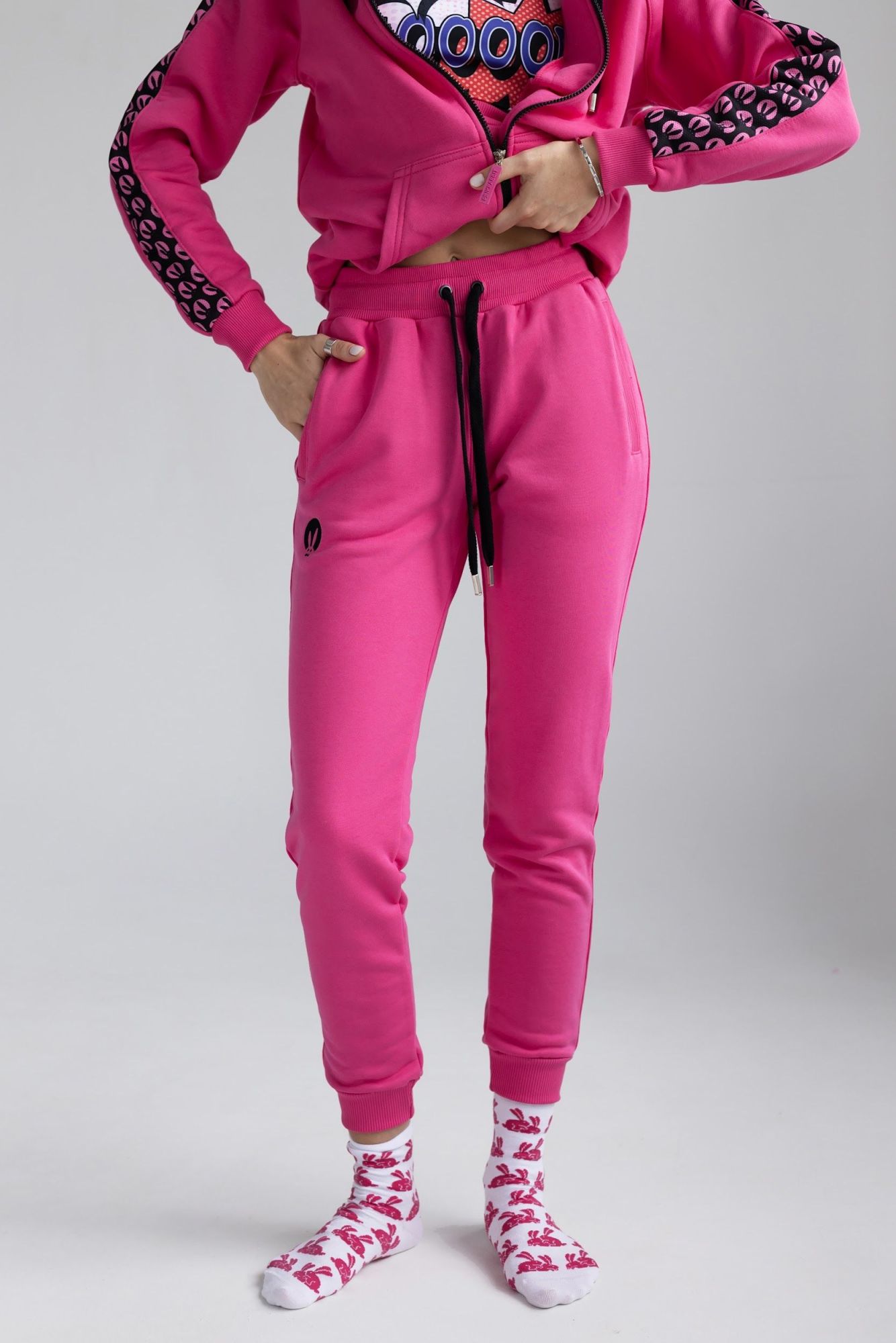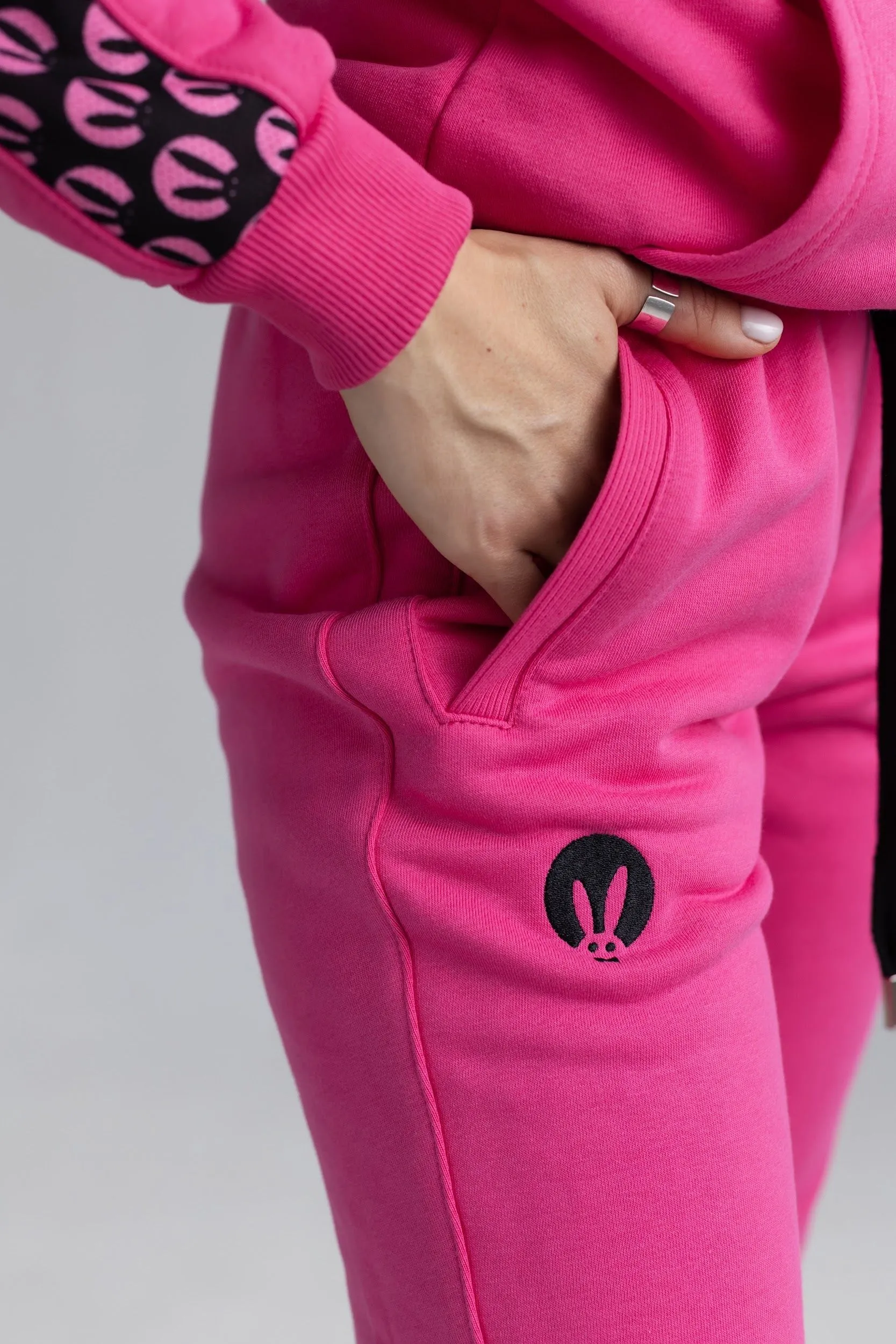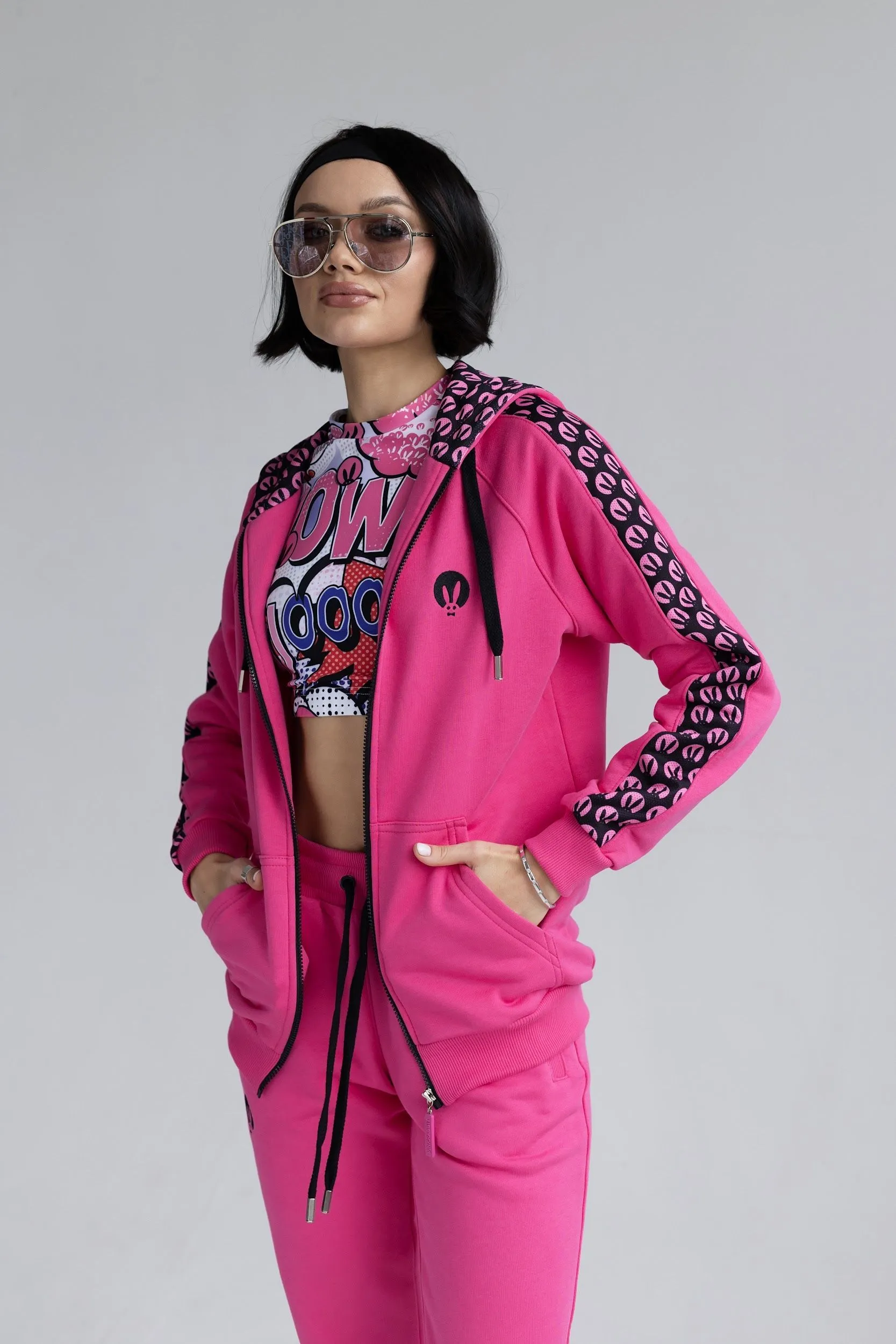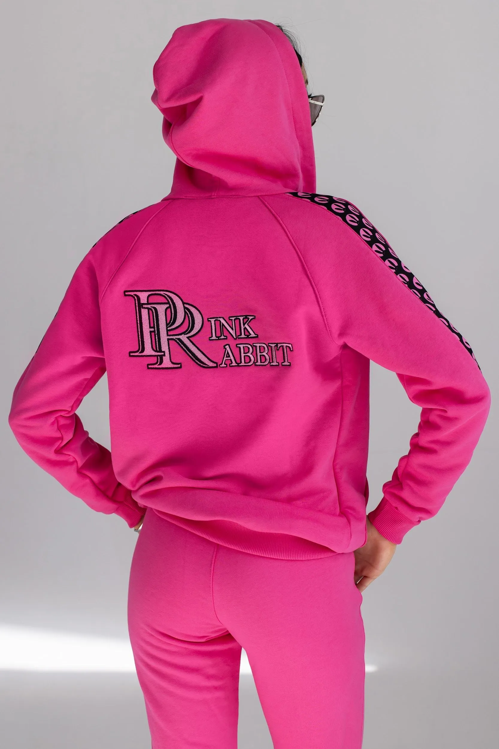 Розовый спортивный женский костюм от Pink Rabbit выполнен из хлопкового футора. Костюм состоит из бомбера и брюк. Подходит как для пробежки в парке, так и для расслабленного отдыха. А если добавить аксессуары и туфли на каблуке, то можно смело отправляться в нём на вечеринку.