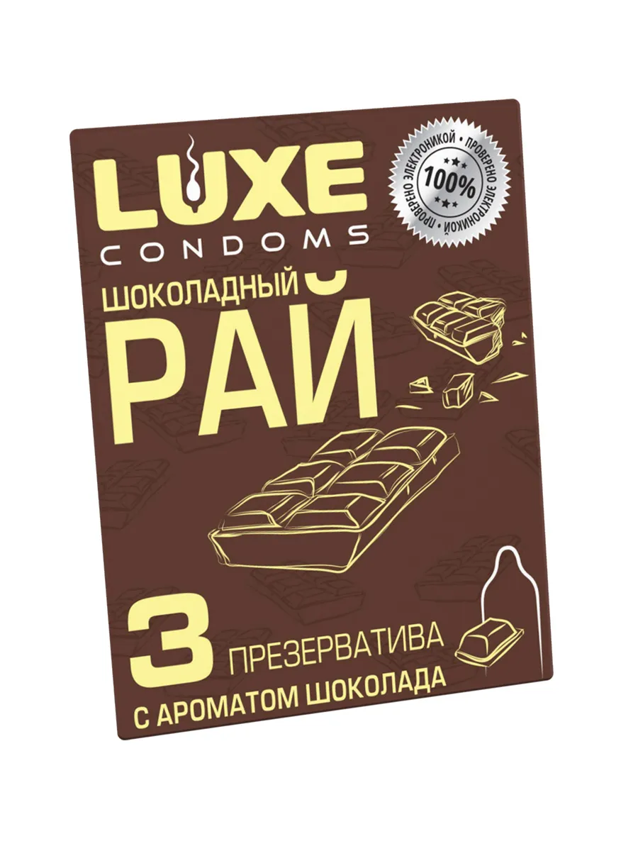 Удивите партнера и порадуйте себя новыми ощущениями! Вкусное и качественное удовольствие с презервативами LUXE с ароматом шоколада Шоколадный рай. Три латексных презерватива с накопителем и смазкой в яркой фирменной упаковке. Гладкая поверхность и силиконовая смазка для качественного и длительного скольжения. Наслаждаться процессом, не беспокоясь о безопасности, легко с презервативами LUXE Шоколадный рай с сладостным, опьяняющим ароматом шоколада. Необычная упаковка с креативным дизайном и многообещающим названием также призвана сделать вашу близость незабываемой. Качественный латекс Силиконовая смазка Гладкая текстура Протестировано электроникой Аромат шоколада Креативная упаковка “конверт” Длина 180 мм Ширина 52 мм Толщина стенок 0,06 мм Количество в упаковке – 3 шт