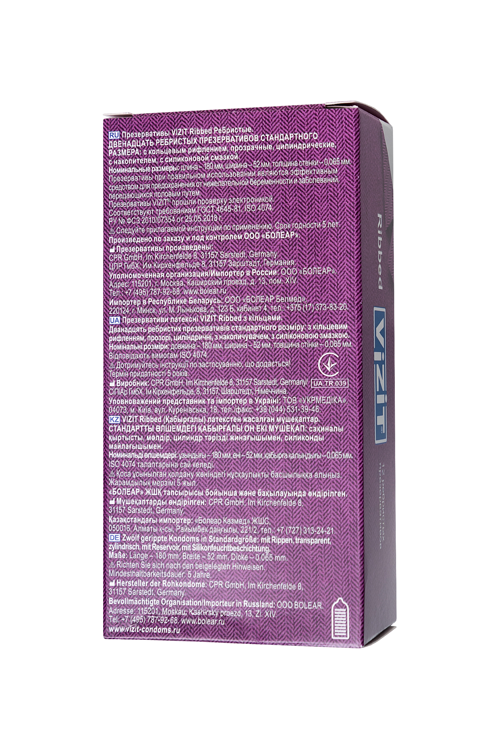 Презервативы VIZIT Ribbed Ребристые, латекс, 18 см О да, с презервативами VIZIT Ribbed вы доведете партнершу до пика наслаждения гораздо быстрее! Стоит впустить в свою интимную жизнь немного экспериментов, и удовольствие заиграет новыми красками. Не забудьте вооружиться презервативами VIZIT с ребристым рельефом. Представьте, как интенсивно будет ласкать кольцевое рифление нежную часть интимных мест в независимости от темпа вашего танца. Да, да и еще раз да! Вот что вы услышите во время близости. Наслаждение тесным контактом с дополнительной стимуляцией стало возможным с презервативами VIZIT Ribbed. Отдайтесь сладкому вожделению с головой, не думая о безопасности, с презервативами VIZIT Ribbed. Цилиндрическая форма контрацептивов с накопителем из эластичного латекса дарят уверенность в надежности и защите от нежелательных факторов. Попробуйте всю линейку презервативов VIZIT, чтобы найти свой идеальный контрацептив Лаконичный дизайн в виде пиджака и галстука, на котором изображен вид презервативов, легко поможет сделать выбор из широкого ассортимента контрацептивов VIZIT. Стильная упаковка и европейское качество презервативов VIZIT по привлекательной цене для вашего удовольствия. Эластичные – прочные и надежные Безопасные – натуральный латекс Силиконовая смазка – обеспечивает комфортный половой акт Длина 180 мм, ширина 52 мм Нейтральный запах – не отвлекает Количество штук в упаковке: 3 шт. Количество штук в упаковке: 12 шт