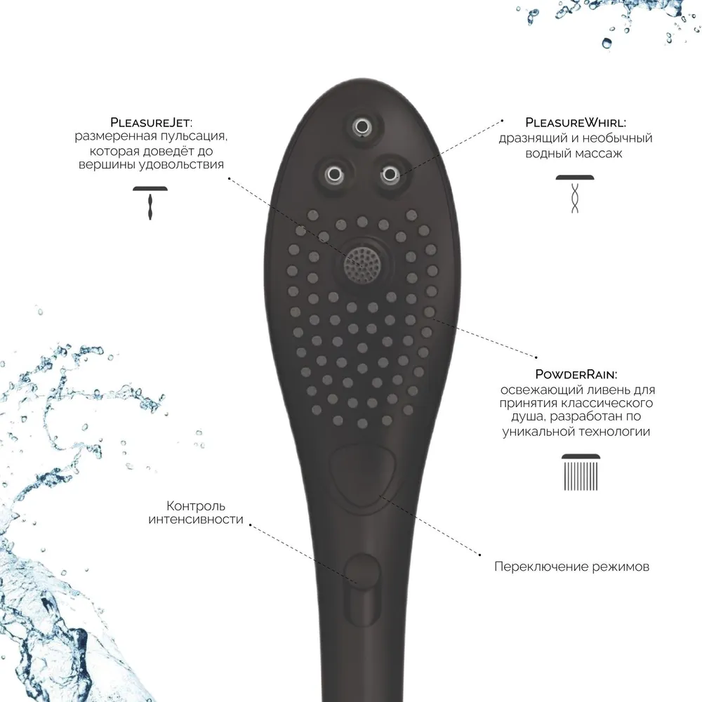 Wave устройство 2 в 1, которое можно использовать как обычную насадку для душа, так и в качестве клиторального стимулятора. 3 режима работы обеспечивают разнообразие ощущений от струй воды. PleasureJet и PleasureWhirl созданы специально для стимуляции деликатных зон, а режим PowderRain для обычного использования насадки в качестве лейки для душа. Простой в управлении Wave оснащен всего одной кнопкой на корпусе, которая отвечает за скорость и интенсивность подачи воды.