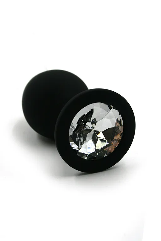 Анальная пробка из силикона черного цвета, размер L. Длина - 8,3 см, диаметр - 4,3 см, вес - 83 грамма. Страз в основании круглой формы, выполнен из прозрачного стекла. Упакована в вельветовый мешочек для хранения.