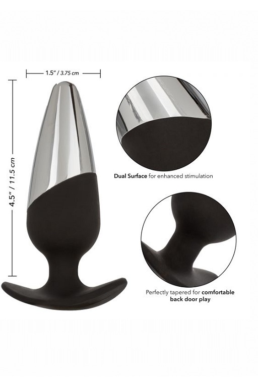 CalExotics Executive Plug – это эксклюзивная анальная пробка, выполненная из двойного материала. Она изготовлена из безопасного для тела силикона и сплава цинка, не содержащего никель.Идеальна для лёгкого введения, благодаря металлическому наконечнику, отличной стимуляции нервных окончаний анального прохода и сфинктера и такого же плавного извлечения.Пробка имеет изогнутое основание, что не только не дает ей провалиться внутрь, но и позволяет носить ее внутри тела и использовать во время полового акта.
