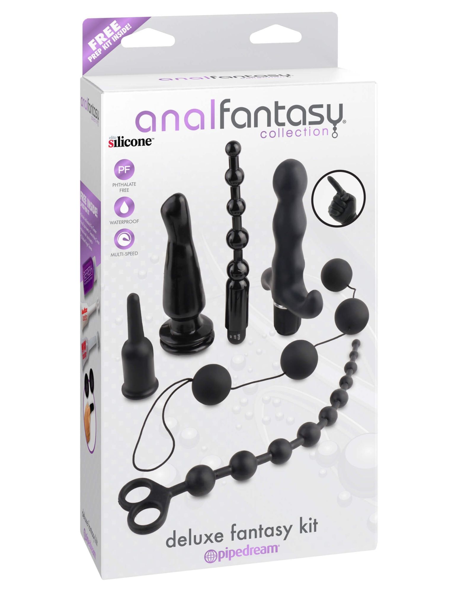 Набор анальных игрушек Deluxe Fantasy Kit подойдет новичкам, желающим познакомиться с анальными ласками, или же тем, кто хочет испытать новые ощущения от использования различных игрушек. В комплекте Вы найдете наперстка для предварительных ласк, анальную пробку с присоской, анальную елочку и массажер простаты с вибрацией, длинную анальную елочку и анальные шарики на сцепке. Каждая из этих игрушек сможет подарить Вам незабываемую стимуляцию и поможет достичь незабываемого оргазма. В комплект также входят лубрикант и очиститель для игрушек.