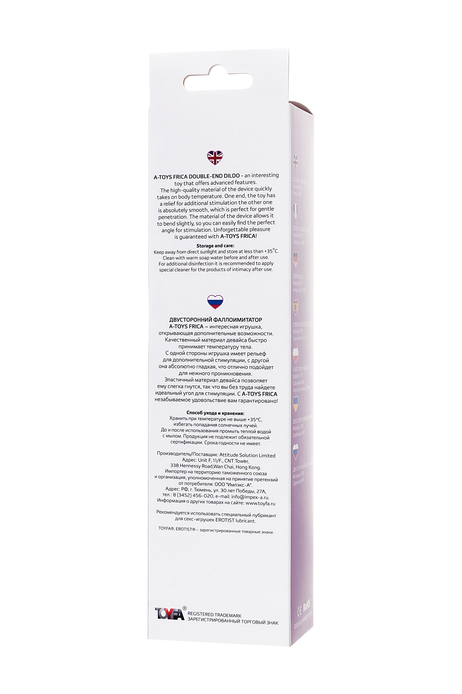 Двусторонний фаллоимитатор A-Toys Frica – интересная игрушка, открывающая дополнительные возможности. Качественный материал девайса быстро принимает температуру тела. С одной стороны игрушка имеет рельеф для дополнительной стимуляции, с другой она абсолютно гладкая, что отлично подойдет для нежного проникновения. Эластичный материал девайса позволяет ему слегка гнутся, так что вы без труда найдете идеальный угол для стимуляции. С A-Toys Frica незабываемое удовольствие вам гарантировано! Общая длина: 23 см Диаметр: 2,4-3,1 см