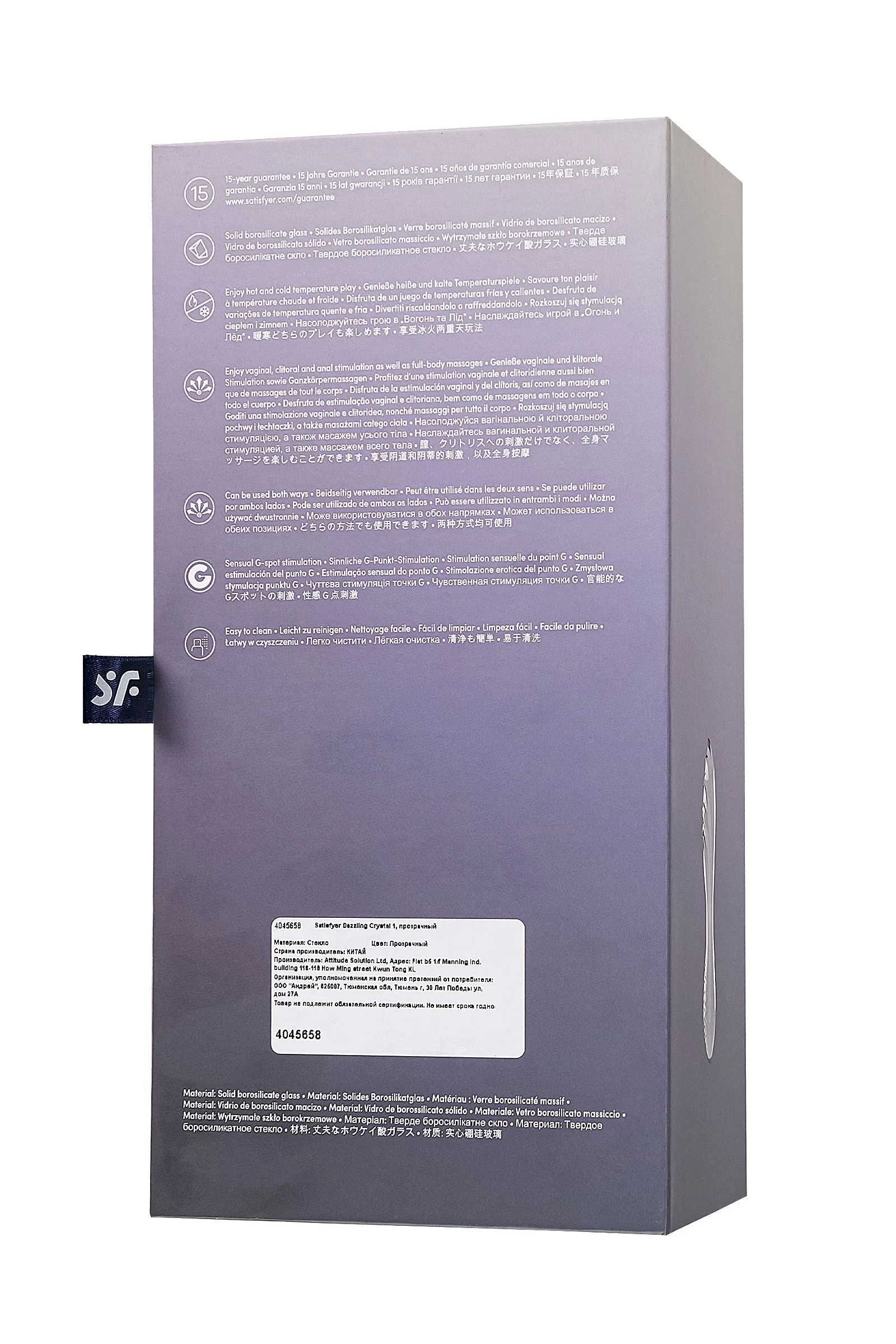 Dazzling Crystal от Satisfyer – это кристально чистое удовольствие. Этот двойной фаллоимитатор перевернет ваши представления об интимном удовольствии. Фаллоимитатор сделан из боросиликатного стекла. Его преимущества – стеклянная элегантность, прочность и гипоаллергенность. Позвольте кристальной ясности проникнуть в ваши интимные моменты. Каждая деталь проработана с любовью и заботой. Satisfyer стремились сделать Dazzling Crystal не просто инструментом, а предметом искусства и наслаждения. Одна сторона предлагает уникальные ребристые ощущения, в то время как другая обворожит вас массажными точками. Никаких компромиссов, только настоящее удовольствие. Экспериментируйте и смело открывайте для себя новые грани удовольствия. Стекло сохраняет температуру. Охладите его под холодной водой или нагрейте нежным теплом – ваши ощущения станут еще более интенсивными. Прозрачное стекло приглашает вас в увлекательный мир сенсаций и фантазий. Для максимального комфорта и безопасности рекомендуем использовать смазку на водной основе.