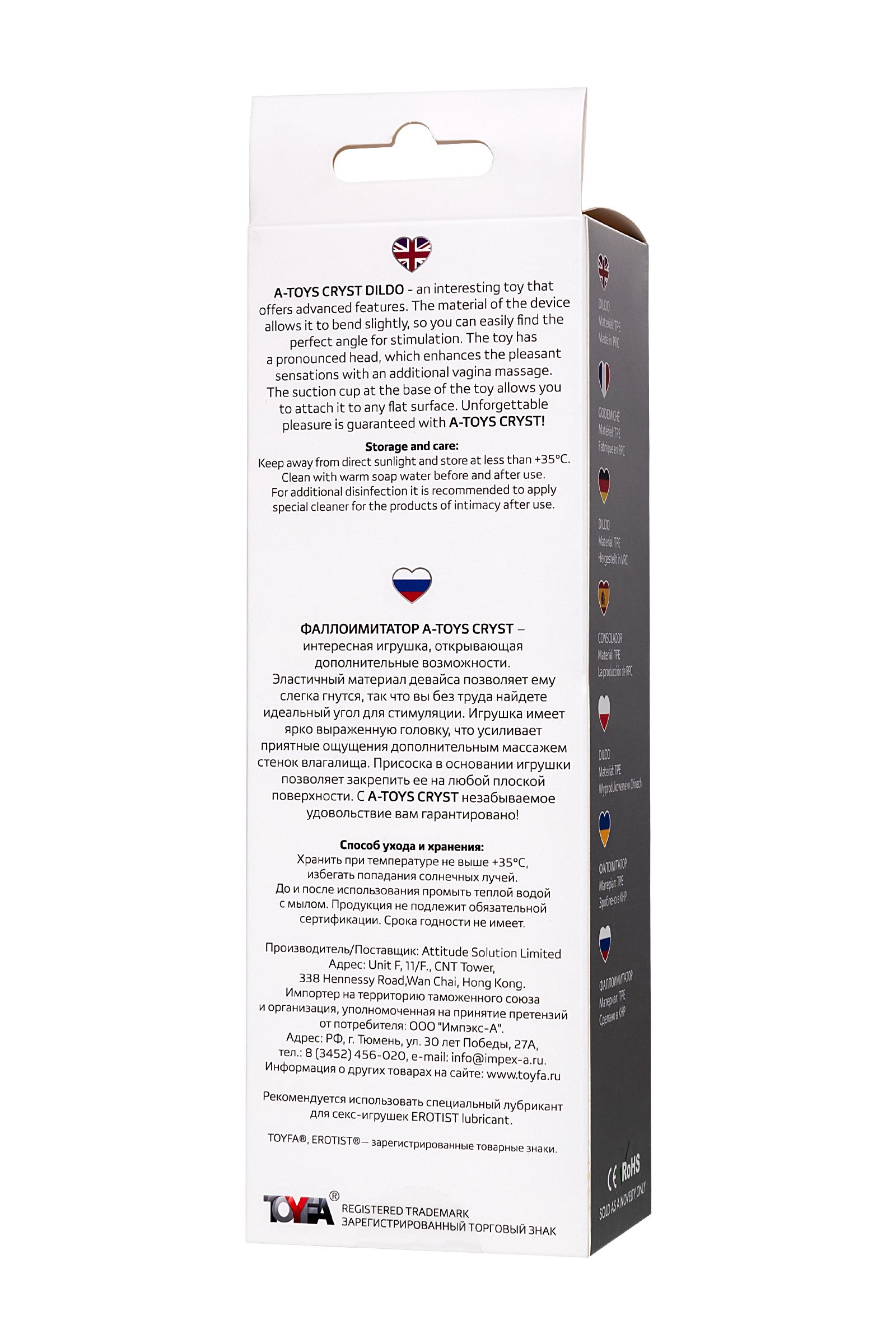 Фаллоимитатор A-Toys Cryst – интересная игрушка, открывающая дополнительные возможности. Эластичный материал девайса позволяет ему слегка гнутся, так что вы без труда найдете идеальный угол для стимуляции. Игрушка имеет ярко выраженную головку, что усиливает приятные ощущения дополнительным массажем стенок влагалища. Присоска в основании игрушки позволяет закрепить ее на любой плоской поверхности. С A-Toys Cryst незабываемое удовольствие вам гарантировано! Общая длина: 15 см Рабочая длина: 10,7 см Диаметр: 2,8 см